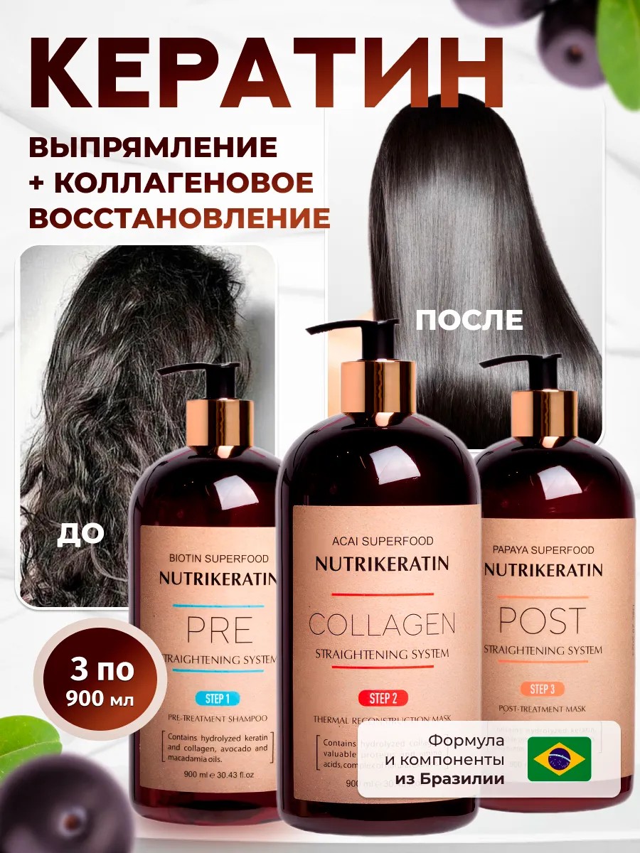 NUTRIKERATIN Professional Acai Superfood COLLAGEN Straightening and Collagen System. Nutrikeratin Acai Superfood Collagen for hair, professional set, 3 stages, 900 ml each. Straightening and collagen restoration for all hair types.