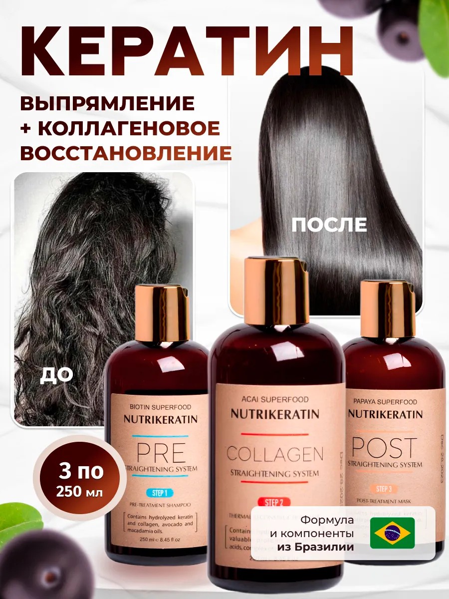 NUTRIKERATIN Кератин для волос с коллагеном для выпрямления, 3 по 250 мл