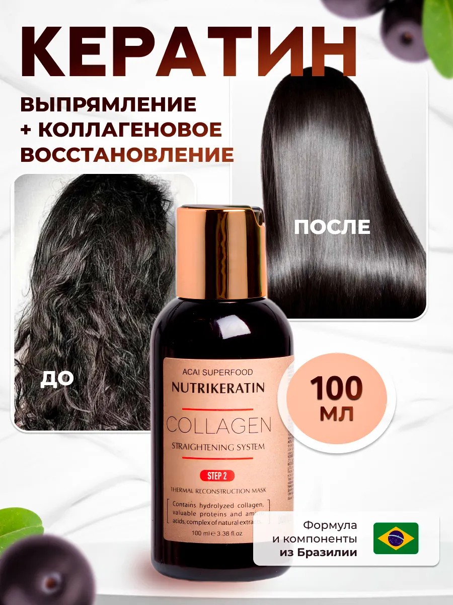 NUTRIKERATIN Профессиональная система выпрямления и коллагенирования Acai Superfood COLLAGEN Straightening System. Нутрикератин Асаи Суперфуд Коллаген для волос, профессиональный состав 100 мл. Выпрямление и коллагеновое восстановление всех типов.