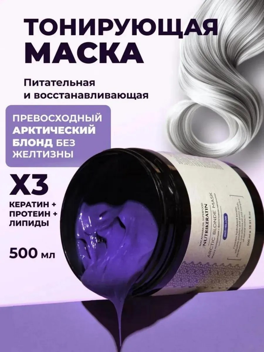 The professional tinting mask with violet pigment, Macadamia Oil Superfood Arctic Blonde Mask from Nutrikeratin, effectively neutralizes unwanted yellow tones on bleached, gray, and natural blonde hair. This toning treatment imparts a cool blonde shade thanks to the high concentration of violet pigments, which neutralize yellow tones. Suitable for bleached, highlighted, dyed, and naturally blonde hair, as well as gray hair. Macadamia oil, combined with a complex of plant extracts and panthenol, intensively moisturizes, nourishes, and conditions hair. Hydrolyzed keratin and proteins restore and strengthen the hair structure, adding density and elasticity.