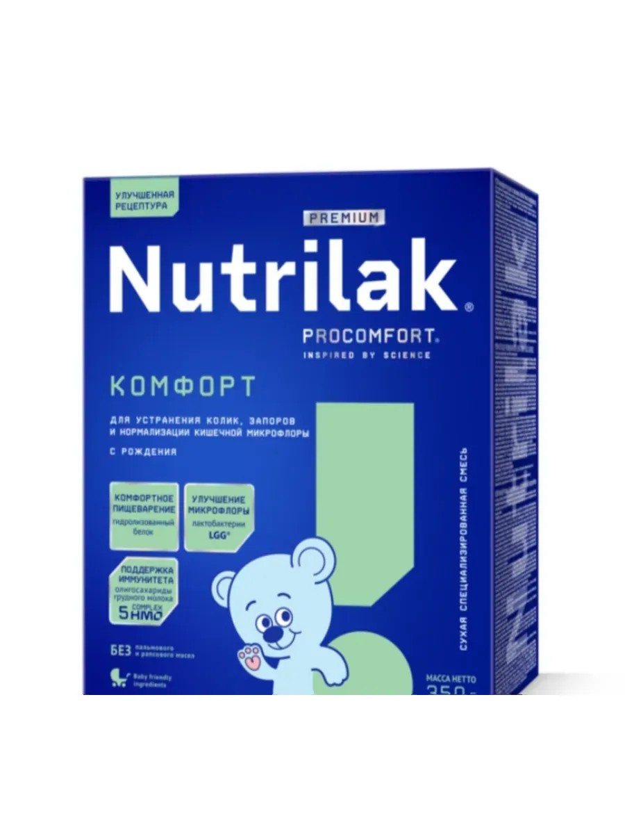 Premium Comfort Dry Infant Formula, 350g. Nutrilak Premium Comfort infant formula is specially formulated for premature and low-birth-weight infants. Its balanced composition, enriched with protein, fats, and carbohydrates, provides the baby with all the necessary nutrients for healthy growth and development. Its high energy value (510 kcal per 100g) helps replenish the energy needs of a growing body. Its dry consistency is easy to prepare and store. Nutrilak Premium Comfort is a reliable choice for caring parents who want to provide the best for their child.