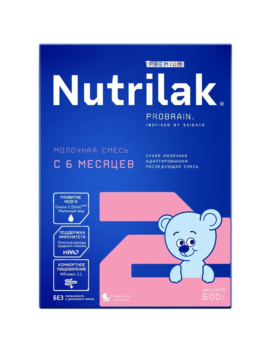 Nutrilak Premium Смесь молочная сухая 2 с 6 до 12 месяцев, 600 г. Детская смесь, последующая, для смешанного и искусственного вскармливания детей. Без пальмового и рапсового масел. Nutrilak Premium ProBrain имеет оптимально сбалансированный состав. Для развития мозга: Омега-3 (DHA) max особые жирные кислоты, необходимые для формирования мозга, нейронных связей и сетчатки глаз. Большое количество DHA эффективно влияет на интеллектуальное развитие ребенка. Молочный жир улучшает усвоение DHA, а фосфолипиды, входящие в его состав, оказывают благоприятное воздействие на память, речь и моторику. Для укрепления иммунитета: Олигосахариды грудного молока (HMO 2' FL)1 поддерживают иммунную систему и защищают от инфекций. Для комфортного пищеварения: Белок WProtein 2:12 легко усваивается и способствует комфортному пищеварению. DHA max – высокое содержание DHA в соответствии с рекомендациями европейских экспертов (Директива EC 127/2016). 1 HMO 2' FL – Олигосахариды грудного молока 2-фукозиллактоза. 2 WProtein 2:1 – Whey Protein – соотношение сывороточных белков и казеина в молочной смеси 2:1. ВАЖНО! Смесь в новом дизайне выпускается с улучшенной рецептурой. Если вы кормили ребенка Nutrilak Premium в старом дизайне, то мы рекомендуем плавный переход на новую формулу.