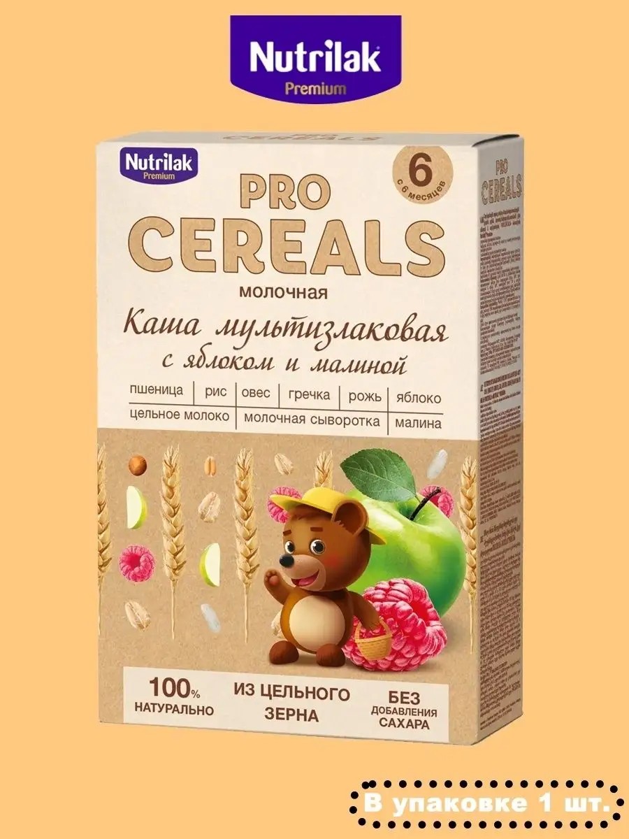 Каша Nutrilak молочная PROCEREALS мультизлаковая с яблоком и малиной, с 6 месяцев, 200 г предназначена для кормления детей начиная с 6 месяцев. При производстве каши использовались цельные зерна злаков, что позволило сохранить всю природную ценность зерна: питательные и минеральные вещества, витамины и пищевые волокна. Поэтому такую кашу не нужно обогащать дополнительно. В составе нет консервантов, ароматизаторов и других лишних добавок - только цельнозерновая мука, сухое цельное молоко, сухая деминерализованная молочная сыворотка и хлопья фруктов. Это на 100 % натуральный продукт, в котором нет добавленного сахара, соли, пальмового масла, красителей, ароматизаторов и консервантов. Сочетание пяти злаков с добавлением яблока и малины расширяет вкусовую палитру малыша. Природные пищевые волокна из оболочки зерна помогают регулярной работе пищеварительной системы ребенка. А отсутствие сахара и соли способствует формированию у ребенка правильных вкусовых привычек.