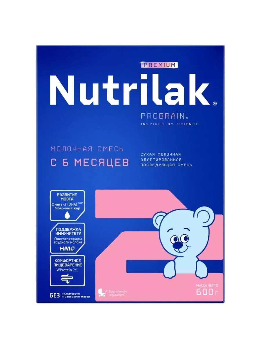 Nutrilak Смесь детская молочная Нутрилак Премиум, без пальмового масла.Смесь молочная сухая адаптированная последующаяNutrilak Premium 2 предназначена для смешанного и искусственного вскармливания детей 6 месяцев. Имеет оптимально сбалансированный состав для здорового роста, полноценного интеллектуального развития малыша, поддержания иммунной системы и комфортного пищеварения.В состав смеси входят Омега-3 (DHA) max*особые жирные кислоты, необходимые для формирования мозга, нейронных связей и сетчатки глаз.Молочный жир улучшает усвоение DHA, а фосфолипиды, входящие в его состав, оказывают благоприятное воздействие на память, речь и моторику.Олигосахариды грудного молока (HMO 2 FL)1 поддерживают иммунную систему и защищают от инфекций.Белок WProtein 2:12 легко усваивается и способствует комфортному пищеварению.Без пальмового и рапсового масел.*DHA max - высокое содержание DHA в соответствии с рекомендациями европейских экспертов (Директива EC 127/2016)1 HMO 2 FL - Олигосахариды грудного молока 2-фукозиллактоза2 WProtein 2:1 - Whey Protein - соотношение сывороточных белков и казеина в молочной смеси 2:1Baby friendly ingredients - при производстве смесей Nutrilak используются специально отобранные безопасные ингредиенты для детского питания от лучших мировых производителей.Пищевая ценность в 100 г сухой смеси в 100 мл готовой смесиЭнергетическая ценность, кДж /ккал 2029 / 485 280 / 67Белки, г 9,5 1,3белки молочной сыворотки/ казеин, % 65/35Таурин, мг 43 6Жиры, г 22 3,0молочный жир, % от общего количества жира 25линолевая кислота, г 4,0 0,55линолевая кислота, % от суммы жирных кислот 19?-линоленовая кислота, г 0,48 0,07арахидоновая кислота, мг 10 1,4докозагексаеновая кислота, мг 83 11,5Углеводы, г 62,1 8,6лактоза, г 38,1 5,3лактоза, % от общего количества углеводов 61Пребиотики: 2'-фукозиллактоза, мг 145 20Минеральные вещества:кальций, мг 470 65фосфор, мг 255 35калий, мг 507 70натрий, мг 160 22магний, мг 50 6,9медь, мкг 380 52марганец, мкг 61 8,5железо, мг 8,6 1,2цинк