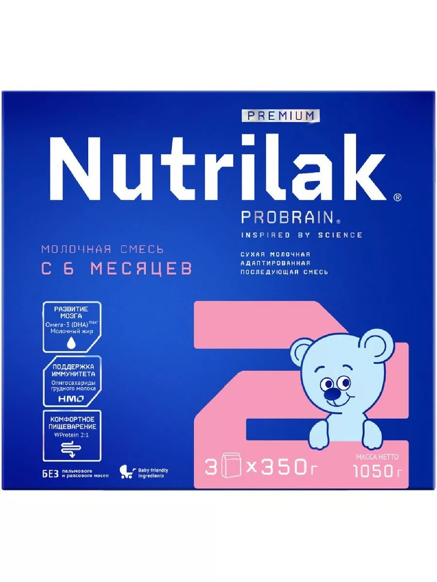 Смесь молочная NUTRILAK Premium 2 адаптированная предназначена для питания детей с 6 месяцев. Она изготовлена без добавления пальмового и рапсового масел и содержит пребиотики для комфортного пищеварения. В состав смеси также входят молочный жир и кислота Омега-3, создающие условия для гармоничного развития мозга. 5 нуклеотидов способствуют активному формированию и укреплению иммунитета ребенка.