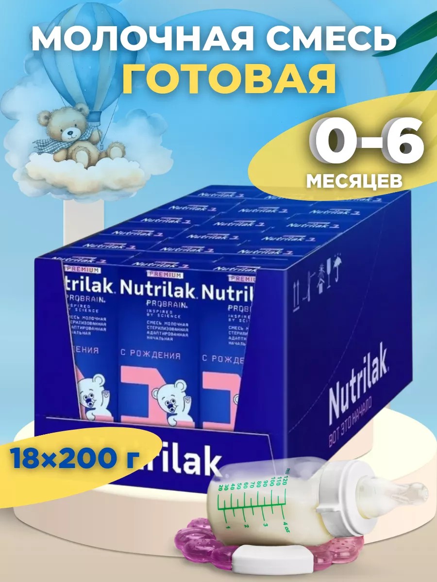 NUTRILAK Premium 1 Готовая Молочная Смесь Стерилизованная {с 0 до 6 мес} в наборе из 18 штук по 200мл адаптированная начальная для смешанного и искусственного вскармливания детей с первых дней жизни. Nutrilak Premium готовая - смесь с полно Цельным составом для полноценного развития. Натуральный молочный жир, содержит необходимые компоненты для правильного развития мозга и обмена веществ. Холестерин, необходимый в раннем возрасте для правильного "программирования" организма и защиты от сердечно-сосудистых заболеваний в будущем. Пальмитиновую кислоту, как в грудном молоке, в форме бета-пальмитата способствующую получению необходимой энергии, лучшему усвоению кальция и профилактике запоров. Молочный жир легко усваивается и является источником энергии для активного роста малыша. Смесь без пальмового и рапсового масла. Нуклеотиды - главные компоненты для формирования иммунной системы и созревания желудочно- кишечного тракта малыша. Сбалансированный витаминно-минеральный комплекс, разработанный специально с учетом потребностей детей первого года жизни.