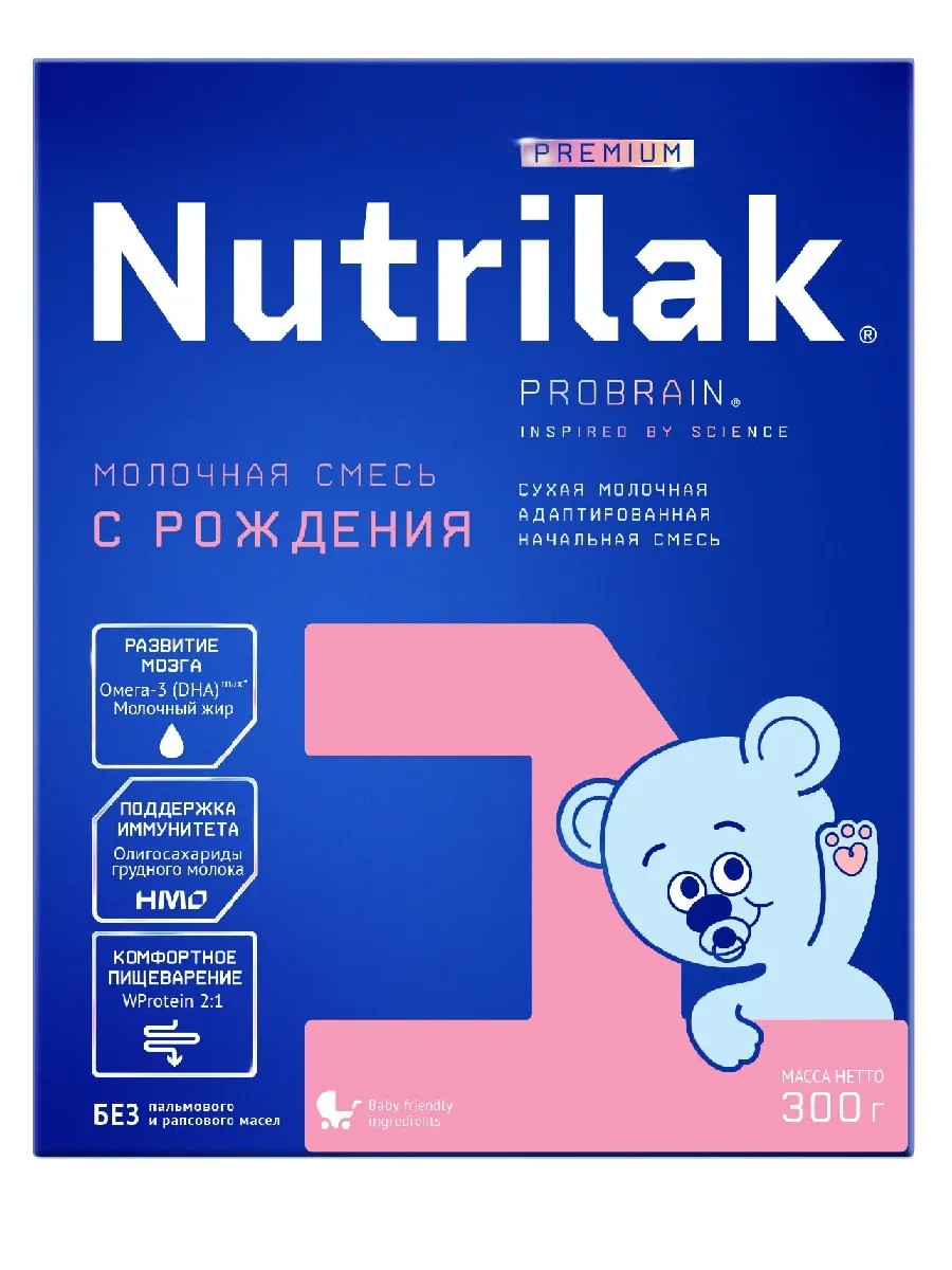 Nutrilak, смесь сухая молочная адаптированная до 6мес., 300г. Nutrilak Premium 1предназначена для смешанного и искусственного вскармливания детей с первых дней жизни до 6 месяцев. Имеет оптимально сбалансированный состав для здорового роста, полноценного интеллектуального развития малыша, поддержания иммунной системы и комфортного пищеварения. В состав смеси входят Омега-3 (DHA) особые жирные кислоты, необходимые для формирования мозга, нейронных связей и сетчатки глаз. Молочный жир улучшает усвоение DHA, а фосфолипиды, входящие в его состав, оказывают благоприятное воздействие на память, речь и моторику.