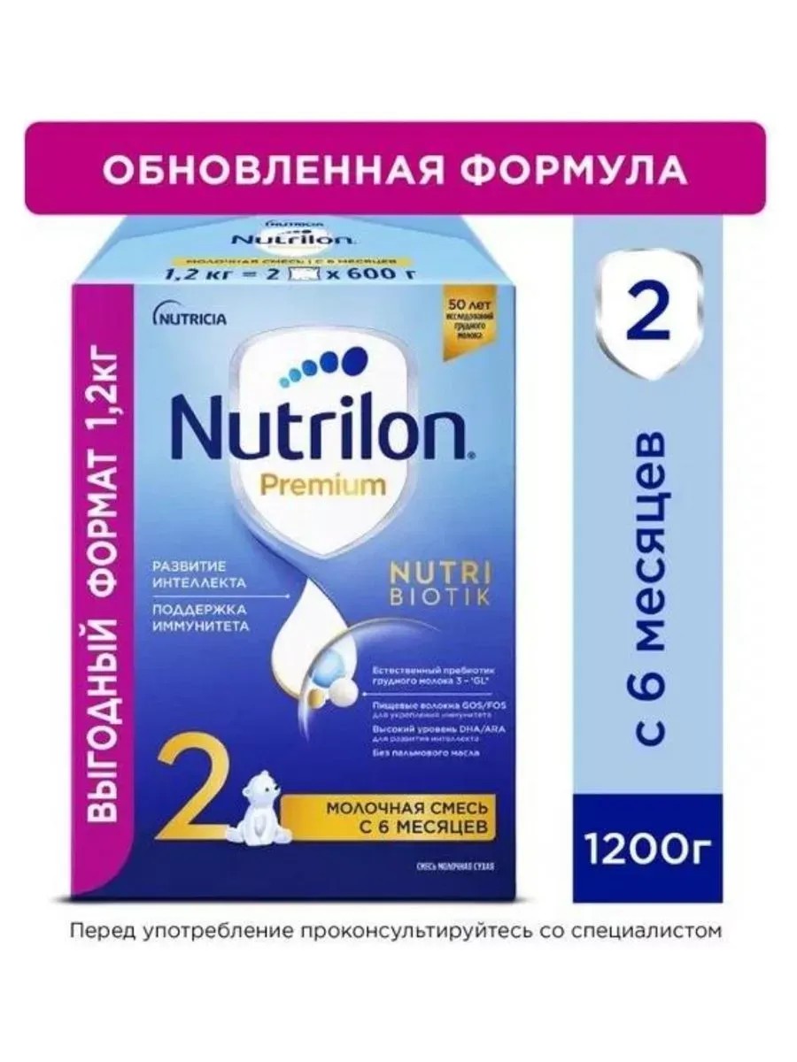 NUTRILON-2 PREMIUM СМЕСЬ МОЛОЧНАЯ СУХАЯ.1200г Формула нового поколения с уникальным комплексом Pronutri* помогает Вашему ребёнку развиваться:•Пребиотики GOS/FOS способствуют развитию собственной здоровой микрофлоры кишечника и поддерживают иммунитет ребёнка, помогая снижать риск возникновения аллергии и инфекций,•Улучшенный комплекс особых жирных кислот ARA/DHA способствует развитию его интеллекта,•Сбалансированный комплекс витаминов и минералов, разработанный специально с учетов потребностей детей до года, способствует правильному росту ребенка.Nutricia более 30 лет занимается изучением грудного молока. Благодаря многолетним научным исследованиям молочные смеси Nutrilon по составу и основным свойствам приблизились к совершенству.Грудное молоко - лучшее питание для детей раннего возраста.Premium = ПремиальныйPronutri+ = Пронутри+В каких случаях используется Nutrilon 2 Premium?Для детей раннего возраста грудное молоко является наилучшим питанием. Nutrilon 2 Premium используется в питании малышей при недостатке грудного молока у мамы или отсутствии возможности грудного вскармливания.В состав смеси входит уникальный комплекс пребиотиков IMMUNOFORTIS, по составу и свойствам приближенный к пребиотикам грудного молока и естественным образом способствующий укреплению иммунной системы малыша.В состав сухой молочной смеси Nutrilon 2 в соотношении, близком к грудному молоку, входят особые жирные кислоты ARA, DHA, которые важны для правильного формирования головного мозга и органов зрения ребенка.Смесь обогащена селеном и бета-каротином для защиты организма ребёнка и поддержания его иммунитета.Nutrilon 2 содержит белок в количестве 1,8 г на 100 мл смеси, что соответствует возросшим потребностям ребёнка второго полугодия жизни.Перед применением смеси проконсультируйтесь со специалистом.Несоблюдение инструкций по приготовлению и хранению смеси может нанести вред здоровью ребенка.Никогда не оставляйте Вашего ребенка одного во время кормления.
