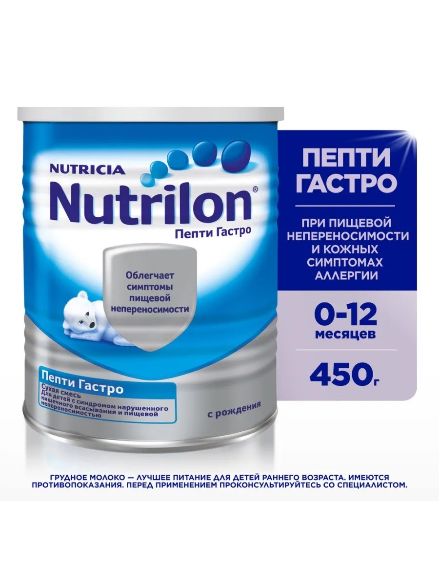 Важно! Для питания детей раннего возраста предпочтительнее грудное вскармливание. Перед применением смеси проконсультируйтесь соспециалистом. Для питания детей с рождения. Смесь разработана специально для детей с синдромом нарушенного всасывания. Содержит глубоко гидролизованный белок, имеющий высокую усвояемость, легко всасываемые жиры и нуклеотиды для хорошего пищеварения и удовлетворяет высокие энергетические потребности растущего ребенка. Поскольку у детей с нарушенным всасыванием нередко наблюдается лактазная недостаточность, эта смесь не содержит лактозу.Nutrilon Пепти Гастро может применяться как единственный источник питания при отсутствии возможности грудного вскармливания, так и для частичной замены рациона.А знаете ли Вы, что…Аллергические поражения органов пищеварения встречаются с такой же частотой, как и аллергические дерматиты (76,1% и 83,3% соответственно), однако до сих пор диагностируются достаточно редко.Состав: Глюкозный сироп (полисахариды, мальтоза, глюкоза), гидролизованный концентрат белков молочной сыворотки, среднецепочечные триглицериды, смесь масел (рапсовое, подсолнечное, пальмовое, Mortierella alpina), эмульгатор эфир лимонной кислоты и моно и диглицеридов жирных кислот, минеральные вещества, рыбий жир, холин, витаминный комплекс, таурин, инозит, микроэлементы, L – карнитин, нуклеотиды.Грудное молоко – лучшее питание для детей раннего возраста. Перед применением продукта необходимо проконсультироваться со специалистом.