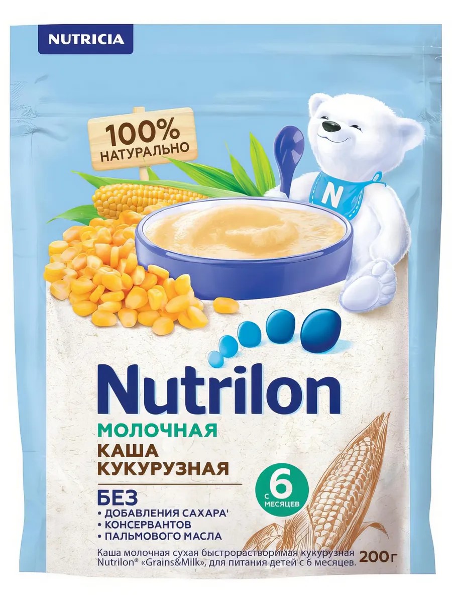 Nutrilon Corn Milk Porridge is a 100% natural cereal with no artificial additives, including colors or preservatives. It contains only natural corn kernels, steamed using a special technology to maximize the preservation of vitamins, minerals, and flavor, and whole milk powder! This vibrant Nutrilon corn milk porridge will help diversify the diet of a baby already familiar with dairy-free cereals. Suitable for children aged 6 months and older. The benefits of natural grains! We carefully select raw materials and produce baby cereals to high quality standards! Each batch of cereals meets European and Russian food safety requirements and is tested for physical, chemical, and microbiological parameters.
