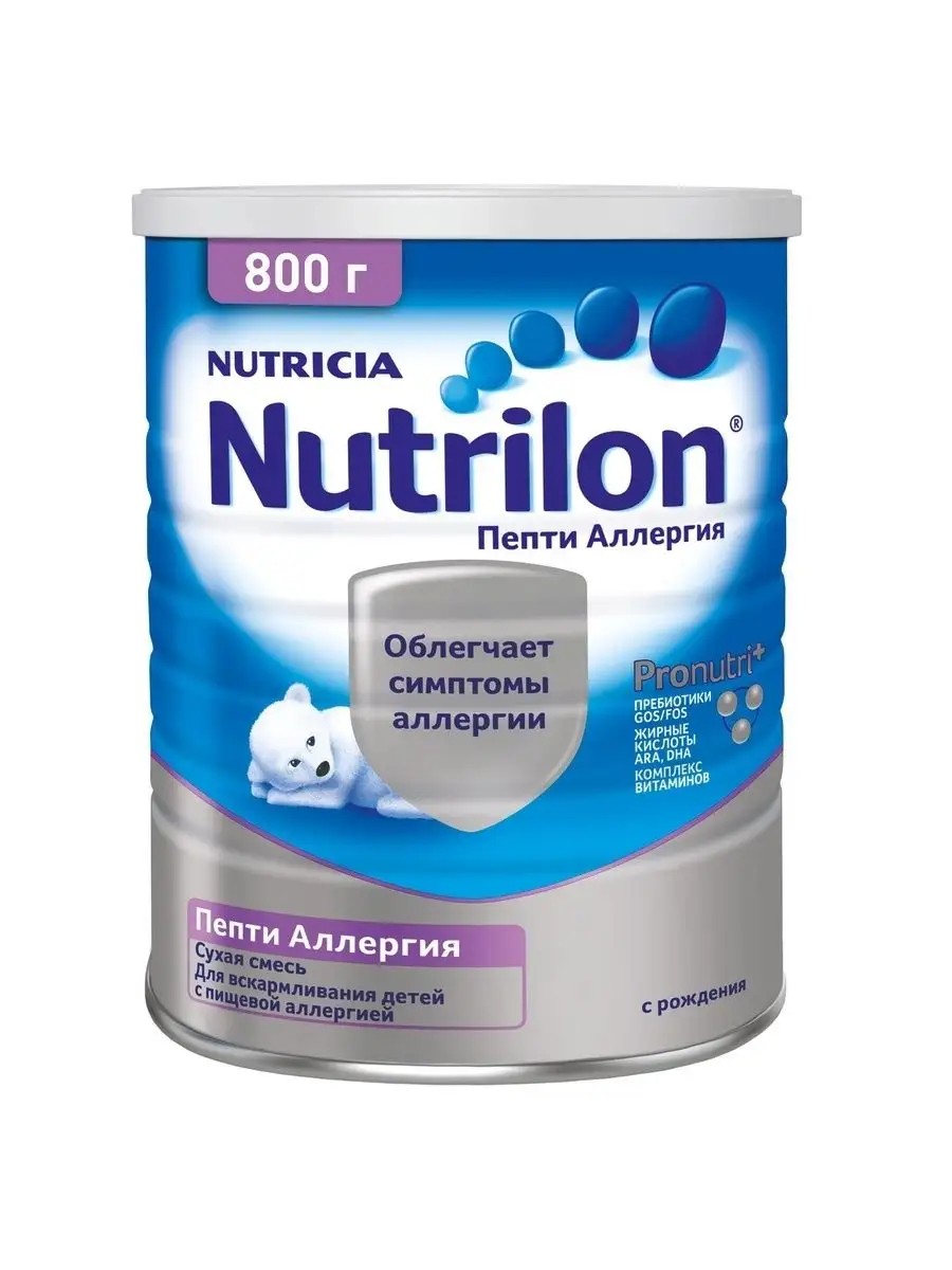 Молочная смесь Nutrilon Пепти Аллергия с рождения 800 г Белки коровьего молока частая причина аллергических заболеваний у детей первого года жизни Поэтому в случае если у ребенка имеются аллергические заболевания и грудного молока матери недостаточно важно подобрать питание со сниженными аллергенными свойствами и вместе с тем способствующее здоровому и правильному развитию Детская смесь Nutrilon Пепти Аллергия разработана на основе международных рекомендаций специально для детей страдающих аллергическими заболеваниями Благодаря глубоко расщепленному сывороточному белку аминокислотный спектр которого соответствует спектру грудного молока Стул ребенка получающего данную смесь может приобрести зеленоватый цвет что также обусловлено присутствием в смеси гидролизованного белка Эффективность данной смеси обусловлена применением наряду с другими компонентами высокогидролизованного сывороточного белка Поэтому для вкуса смеси характерно присутствие горьковатой или терпкой ноты.