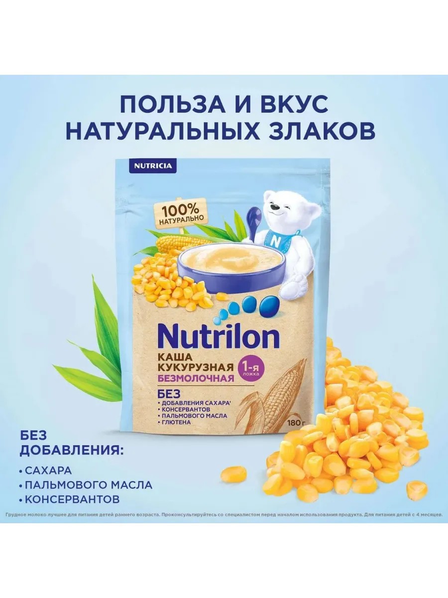 Каша безмолочная Nutrilon Кукурузная, с 5 месяцев, для первого прикорма – 100% натуральная каша без искусственных добавок, в том числе красителей и консервантов. В составе только молотое зерно кукурузы с природным содержанием витаминов и минералов.