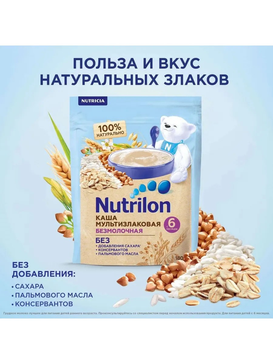 В составе только молотые зерна риса, пшеницы, овса и гречихи с природным содержанием витаминов и минералов. Безмолочная быстрорастворимая мультизлаковая каша Нутрилон разработана для питания детей с 6 месяцев.