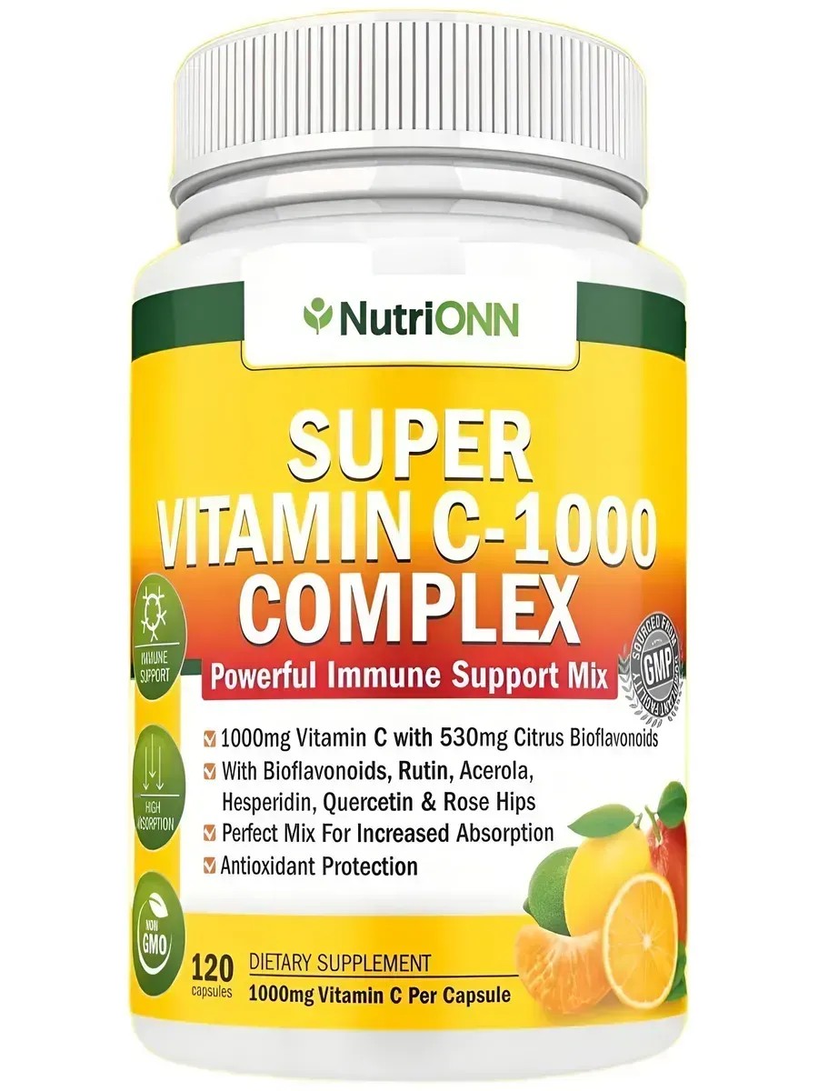 NutriONN Vitamin C Complex (120 capsules) is a premium complex manufactured from the finest raw materials and under strict quality control standards without the addition of artificial ingredients, fillers, or binders. Reduces the duration and intensity of unpleasant respiratory symptoms. This unique formula includes powerful antioxidants such as vitamin C, zinc, and rose hips. The synergistic effect of these specially selected ingredients provides immune protection against harmful environmental influences. Unlike our product, other immune support products contain fillers and artificial ingredients that can further suppress your immune system (immunosuppressants). Vitamin C for adults improves well-being and the condition of skin, hair, and nails. Vitamin C powder in the daily diet strengthens blood vessel walls, improves calcium and iron absorption, and protects against stress. Vitamin C is a versatile component used for comprehensive antioxidant protection. For better absorption, we recommend taking vitamin C with zinc chelate, which will further strengthen the body's barrier functions, enhance the antioxidant effect, and improve the structure of hair and nails. Vitamin C helps slow the aging process, restore strength and energy, and strengthen the immune system. Consult a doctor before use. Our brand also offers a wide selection of vitamins, microelements, and amino acids for the whole family: men, women, and children. Dietary Supplement Information Serving Size: 2 Capsules Servings Per Container: 60 Amount Per Serving Vitamin C (as ascorbic acid) 1000 mg Citrus Bioflavonoid Complex 50% 530 mg (concentrate from lemons, oranges, grapefruit, limes, and tangerines) Rutin 50 mg Hesperidin Complex (from citrus) 50 mg Acerola Powder 10 mg Quercetin Lihydrate 50 mg Rose Hips (fruit) 5 mg Other Ingredients: Vegetable stearic acid, calcium carbonate, hydroxypropyl methylcellulose, vegetable magnesium stearate, and silica.