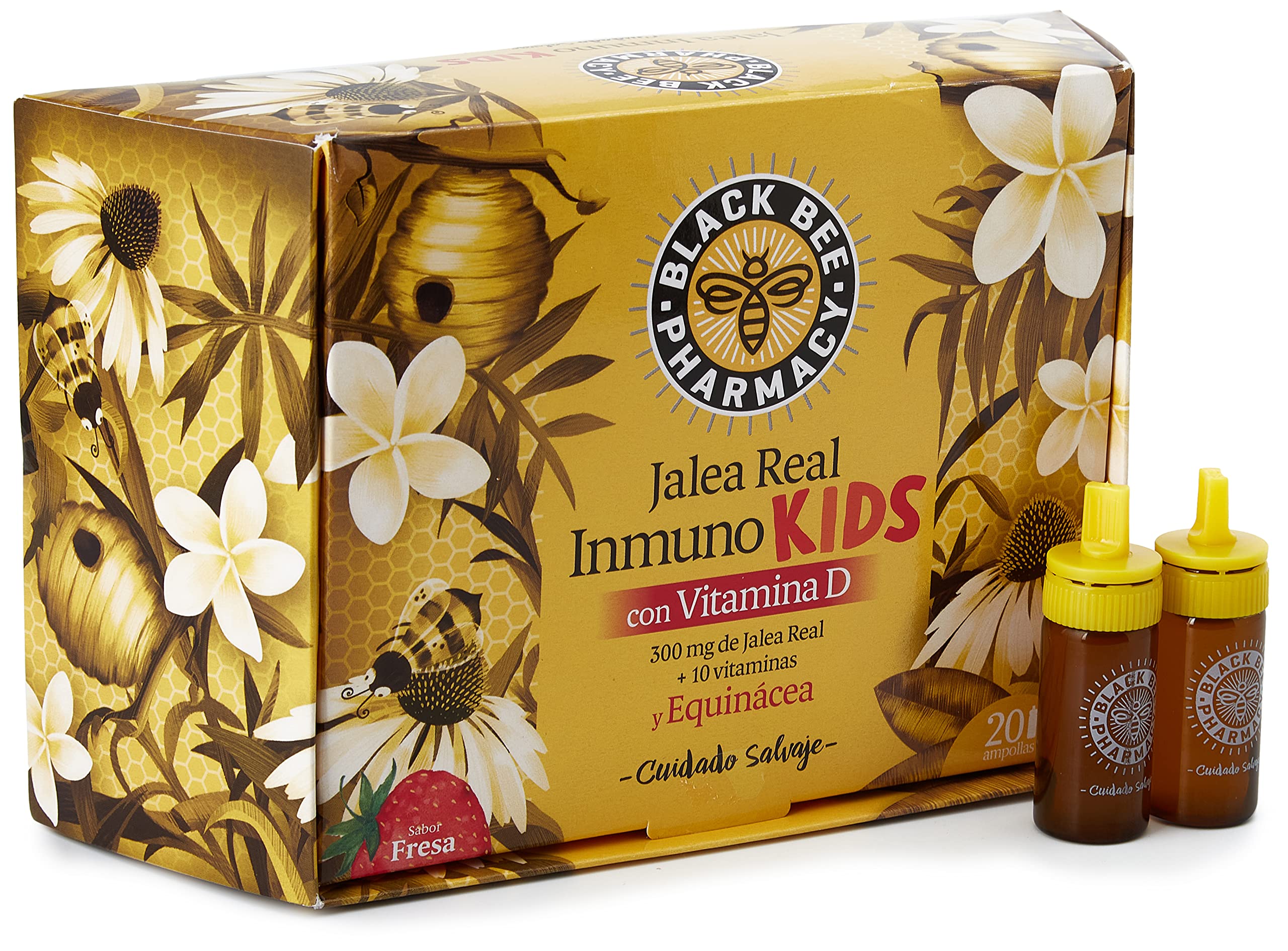 Discover BLACK BEE Pharmacy's vitamin D children's food supplement, which boosts vitality and immunity for little ones aged 3 and up, supporting their growth and development. BLACK BEE Pharmacy is a food supplement brand based on the properties of beehive products, a complex ecosystem from which bees produce valuable substances. Wild bees are truly tireless. So strong and so fragile. Today, they are truly endangered. Without them, without their constant connection with flowers and pollen, 60 of the plant world would disappear. That's why at BLACK BEE Pharmacy, we make our jelly with the same care with which bees select their flowers. Food supplements should not be used as a substitute for a balanced diet. A varied and balanced diet and a healthy lifestyle are important. INGREDIENTS Water, fructose, jelly, echinacea dry extract (Echinacea purpurea (L.) moench, herbs), elderberry juice (0.5 ), vitamin C (L-ascorbic acid), flavouring, preservative (potassium sorbate), niacin (nicotinamide), lemon juice, powder, pantothenic acid (D-pantothenate, calcium), vitamin B12 (cyanocobalamin), vitamin D (cholecalciferol), vitamin B6 (pyridoxine hydrochloride), thiamine (thiamine hydrochloride), riboavin, folic acid (teroylmonoglutamic acid), biotin (D-biotin) INSTRUCTIONS FOR USE Take 1 to 2 vials of 10 ml per day according to age (children from 3 to 6 years: 1 vial from 7 to 12 years: 2 vials). Shake before use. SAFETY WARNING: Do not exceed the recommended daily dose. Food supplements are not a substitute for a varied and healthy diet. Keep out of the reach and sight of children. See moreSmart choice for daily needs. It is easy to clean. Product made with the latest technology. It can meet different needs. Made with compact design, easy to carry.Black Bee Immuno Kids, Echinacea Voedingssupplement en 10 Vitaminen, Strawberry Smaak, 20 Ampullen Ontdek het voedingssupplement voor kinderen met vitamine D van BLACK BEE Pharmacy, een versterking van de vitaliteit en afweer voor de kleinsten vanaf 3 jaar en ondersteunt hen bij groei en ontwikkeling. BLACK BEE Pharmacy is een voedingssupplement merk dat gebaseerd is op de eigenschappen van bijenkastproducten, een complex ecosysteem waarvan bijen interessante stoffen produceren. De wilde bij om authentiek onvermoeibaar te zijn. Zo sterk en zo breekbaar. Vandaag wordt ze echt bedreigd. Zonder dat, zonder hun voortdurende relatie met bloemen en pollen, zou 60 van de plantenwereld verdwijnen. Daarom maken wij bij BLACK BEE Pharmacy onze gelei met dezelfde zorg waarmee de bijen hun bloemen kiezen. Voedingssupplementen mogen niet worden gebruikt als vervanging voor een evenwichtige voeding. Een gevarieerde en evenwichtige voeding en een gezonde levensstijl zijn belangrijk. INGREDIËNTEN Water, fructose, gelei, echinacea droog extract (Echinacea purpurea (L.) moench, kruiden), vlierbessap (0,5 ), vitamine C (L-ascorbinezuur), aroma, conserveringsmiddel (kaliumsorbaat), niacine (nicotinamide), citroensap, poeder, pantotheenzuur (D-pantotheenaat. calcium), vitamine B12 (cyanocobalamine), vitamine D (cholecalciferol), vitamine B6 (pyridoxinehydrochloride), thiamine (thiaminehydrochloride), riboavine, foliumzuur (teroylmonoglutaminezuur), biotine (D-biotine) GEBRUIKSAANWIJZING Neem 1 tot 2 flacons van 10 ml per dag volgens leeftijd (kinderen van 3 tot 6 jaar: 1 injectieflacon van 7 tot 12 jaar: 2 injectieflacons). Voor gebruik schudden. VEILIGHEIDSWAARSCHUWING Overschrijd de aanbevolen dagelijkse dosis niet. Voedingssupplementen zijn geen vervanging voor een gevarieerde en gezonde voeding. Buiten het bereik en zicht van kinderen bewaren Meer bekijkenSlimme keuze voor dagelijkse behoeften. Het is gemakkelijk schoon te maken. Product gemaakt met de nieuwste technologie. Het kan aan verschillende behoeften voldoen. Gemaakt met een compact ontwerp, gemakkelijk mee te nemen.