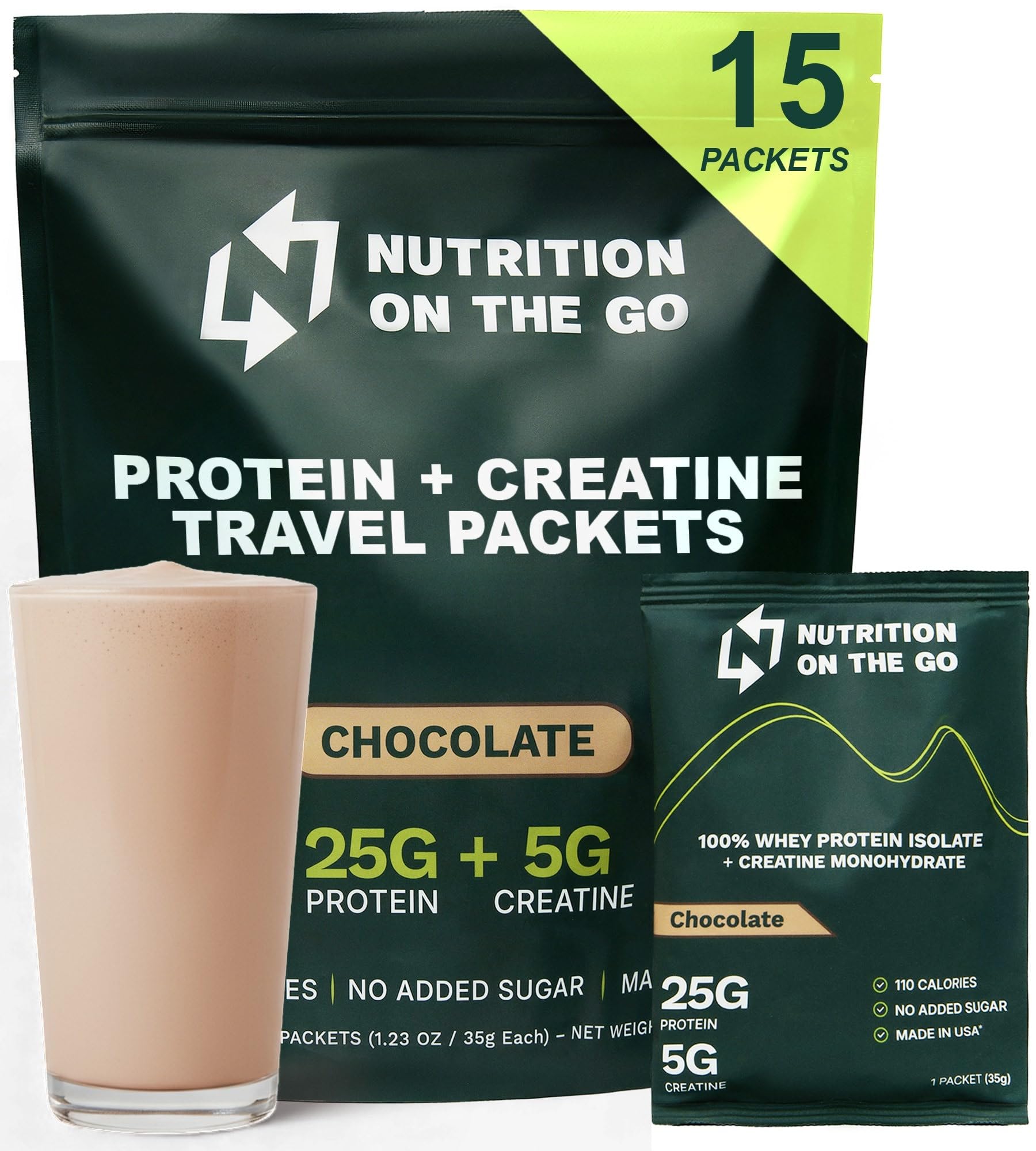 Nutrition On The Go Whey Protein Isolate Packets with Creatine 25g Protein + 5g Creatine Single-Serve Travel Protein Powder Chocolate (15-Pack) Chocolate 15 Packets