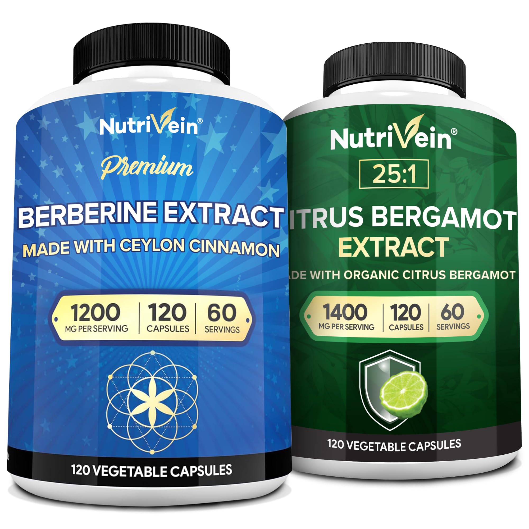 Nutrivein Premium Berberine 1200mg & Citrus Bergamot Extract 1400mg Bundle - Ceylon Cinnamon & 25:1 Bergamia Extract - Weight Management & Immune Support Plus Heart Health - 120 Capsules Each