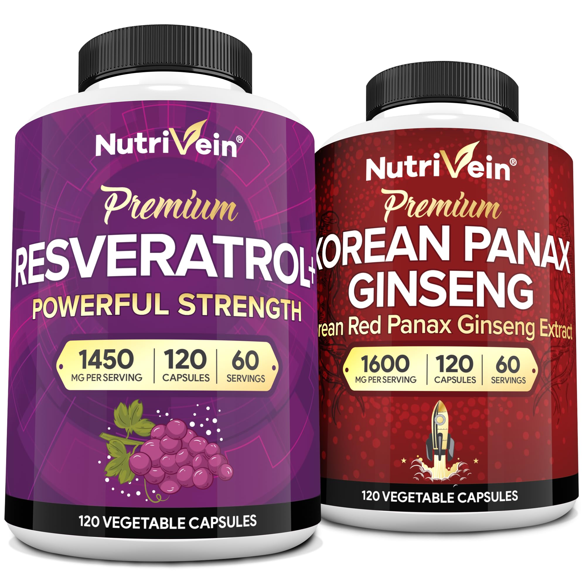 Nutrivein Premium Korean Panax Ginseng Supplement & Resveratrol Supplement Bundle: High-Absorption Resveratrol Capsules & Ginseng for Brain, Defenses, Repair, & Vitality
