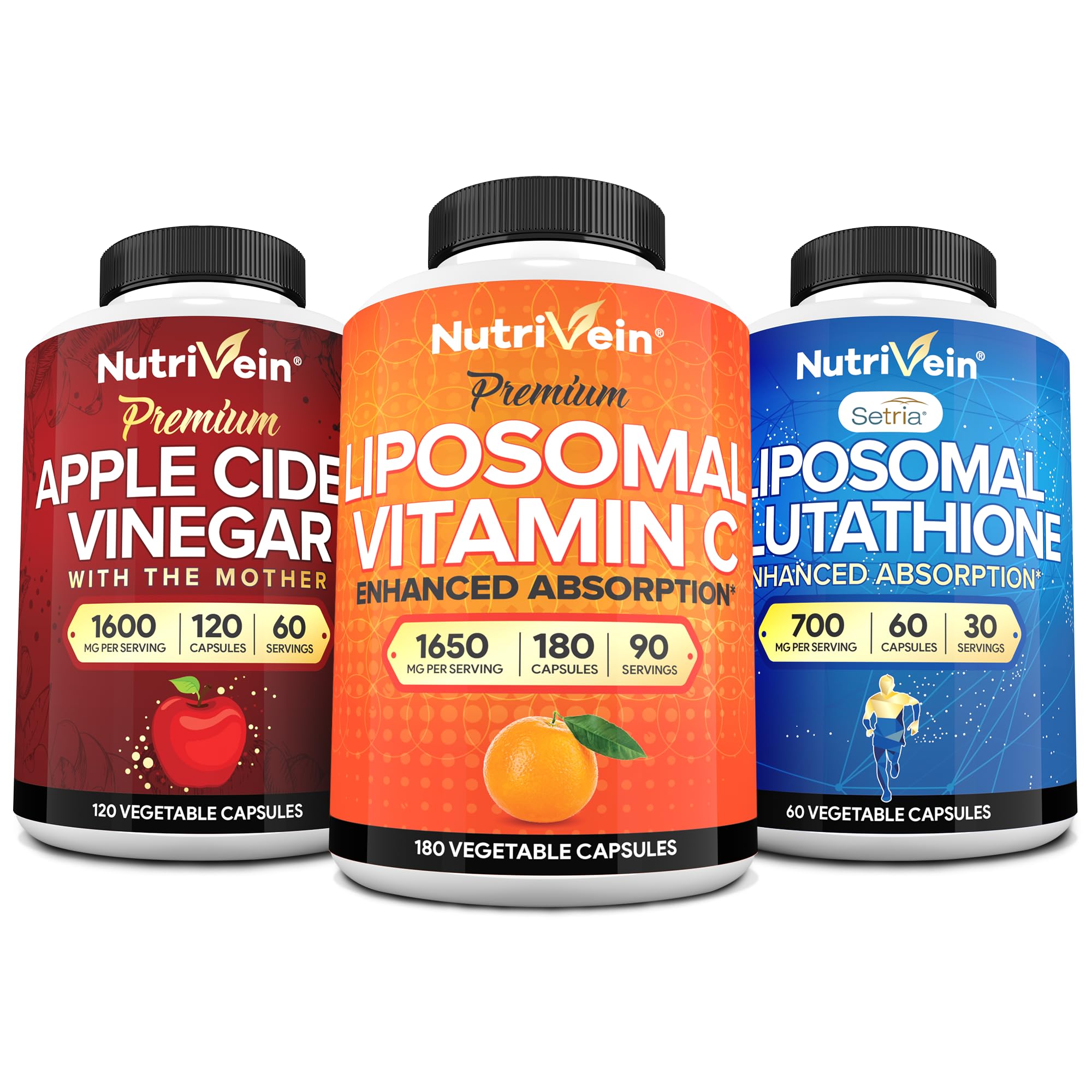 Nutrivein Premium Liposomal Glutathione, Apple Cider Vinegar Capsules, & Vitamin C Supplement Bundle: Vitamin C, ACV Capsules, & Glutathione Supplement Bundle for Cellular Defense & Detox