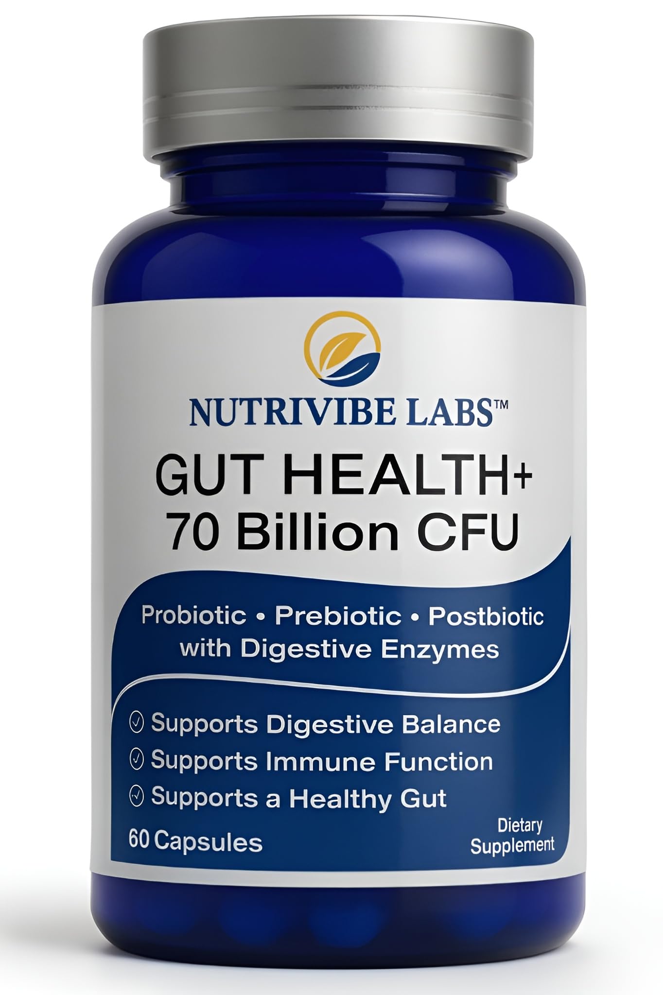 NUTRIVIBE LABS Premium 6-in-1 Probiotic Formula — Gut Health, Digestive Comfort Immune Support Take care of your gut and overall wellness with NUTRIVIBE LABS' 6-in-1 probiotic blend, thoughtfully designed to support everyday digestive comfort, gut health, and immune wellness. Each serving delivers 70 Billion CFU across 10 diverse probiotic strains, helping maintain digestive balance and broad-spectrum gut wellness. Our formula also includes prebiotics, postbiotics, digestive enzymes L-Glutamine, and Zinc L-Carnosine, which work together to nourish live cultures and support a healthy gut environment. This combination helps maintain immune function, daily regularity, and overall wellness naturally and safely. To enhance digestion, we've added a gentle digestive enzyme blend with L-Glutamine Zinc L-Carnosine, supporting the breakdown of carbohydrates, proteins, fats, and fibers. This helps promote comfortable digestion, better nutrient absorption, and regularity as part of your daily wellness routine. Delivered in delayed-release capsules for maximum potency. Crafted with your lifestyle in mind, this probiotic is vegan, Non-GMO, and shelf-stable, requiring no refrigeration. Manufactured in a GMP-certified facility, you can trust the quality and consistency of every capsule. Perfect for daily use and suitable for women men across various dietary needs. Key Benefits Supports Gut Health Digestive Comfort — helps maintain healthy digestion and balance. 70 Billion CFU With 10 Strains — broad-spectrum probiotics for digestive and gut wellness. Supports Immune Function Daily Regularity — probiotics, postbiotics, L-Glutamine, and Zinc L-Carnosine help maintain immune function and digestive regularity. Digestive Enzyme Blend L-Glutamine — supports nutrient breakdown and comfortable digestion. Clean, Vegan Shelf-Stable Formula — Non-GMO, GMP-certified, delayed-release capsules, no refrigeration needed, ideal for daily use. Experience the difference with NUTRIVIBE LABS, a 6-in-1 probiotic designed to support your gut naturally and effectively as part of your daily wellness routine. These statements have not been evaluated by the Food and Drug Administration. This product is not intended to diagnose, treat, cure, or prevent any disease.60 Capsules (30-Day Supply) – Convenient daily support with a full 30-day supply in every bottle. Clean, Vegan Shelf-Stable Plant-based capsules, Non-GMO ingredients, and shelf-stable design — delayed release capsules protect probiotics, no refrigeration required. GMP-certified for quality and suitable for daily use. Perfect for women men. Digestive Enzyme Support with L-Glutamine Zinc L-Carnosine for Smoother Digestion: Includes a gentle digestive enzyme blend with L-Glutamine and Zinc L-Carnosine that helps support the breakdown of everyday meals and promotes comfortable digestion as part of your daily wellness routine. Delayed-Release Capsule – Triple-layer design helps protect probiotics from stomach acid for optimal delivery. Supports Digestive, Immune Health Regularity Probiotics, postbiotics, and added zinc work together to help maintain immune function, daily regularity, and natural gut defenses. 70 Billion CFU with 10 Diverse Strains High-potency probiotic blend designed to help maintain digestive balance and support a healthy microbiome. Advanced 6-in-1 Complete Gut Health Formula: Formulated with probiotics, prebiotics, postbiotics, digestive enzymes L-Glutamine, and Zinc L-Carnosine. Designed to support everyday digestive comfort and gut wellness. Delivered in delayed release capsules for maximum potency. Suitable for women men.