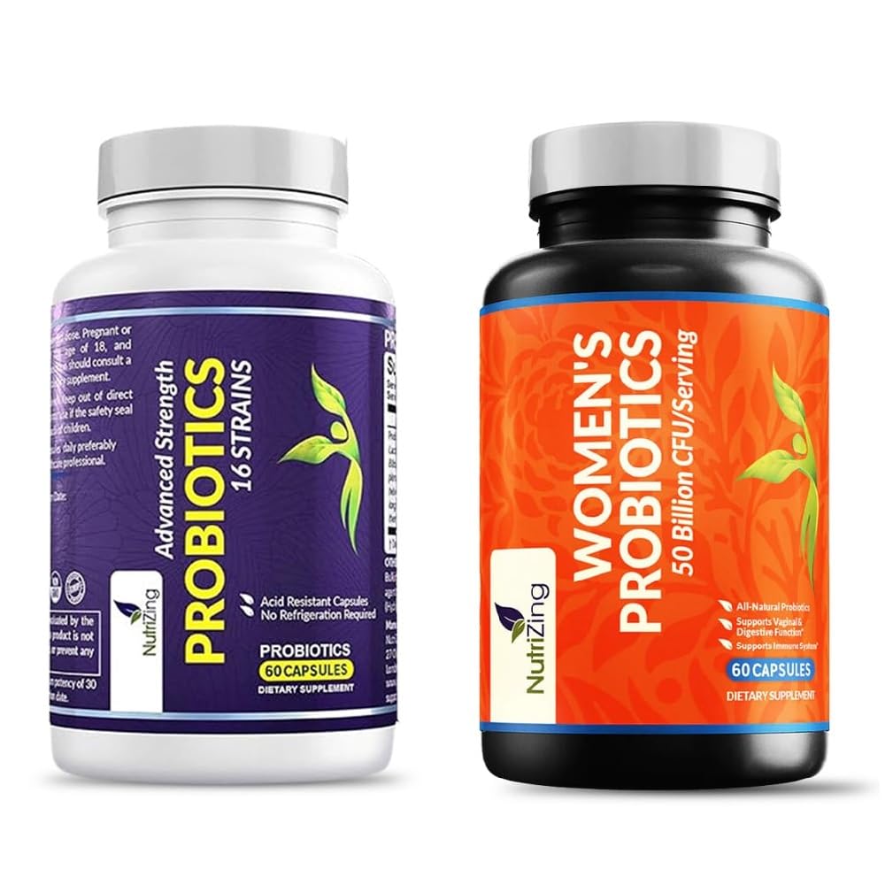 This dual-action NutriZing Probiotic Bundle is expertly designed to support women's complete wellness — combining a 50 Billion CFU women-specific probiotic with vaginal, urinary, and digestive health benefits, and a 30 Billion CFU daily probiotic with 16 strains for balanced gut flora and immunity. Both formulas feature delayed-release vegan capsules, are non-GMO and free from gluten, soy, and dairy, and require no refrigeration — ideal for modern, on-the-go lifestyles.Shelf-Stable Travel Ready – No refrigeration needed! These capsules stay potent through the expiry date, making them convenient for daily use and ideal for travel. Trusted by thousands since 2014. Clean, Vegan Allergen-Free – Made without dairy, soy, gluten, or GMOs, and certified vegan. Each capsule also contains prebiotics to nourish the probiotics for better performance. Maximum Absorption Gut Protection – Both products use delayed-release capsules that resist stomach acid and deliver live cultures directly to the intestines, where they're most effective. Clinically Studied Strains – Includes Lactobacillus reuteri, rhamnosus, acidophilus, fermentum, and more—carefully selected for their proven support in managing bloating, constipation, gas, and feminine health, while promoting a resilient digestive system. Complete Women's Wellness Support – This bundle features two targeted probiotic formulas: a 50 Billion CFU women's blend for urinary tract, vaginal pH, and gut balance, and a 30 Billion CFU daily probiotic with 16 strains for digestive relief, immunity, and overall well-being.