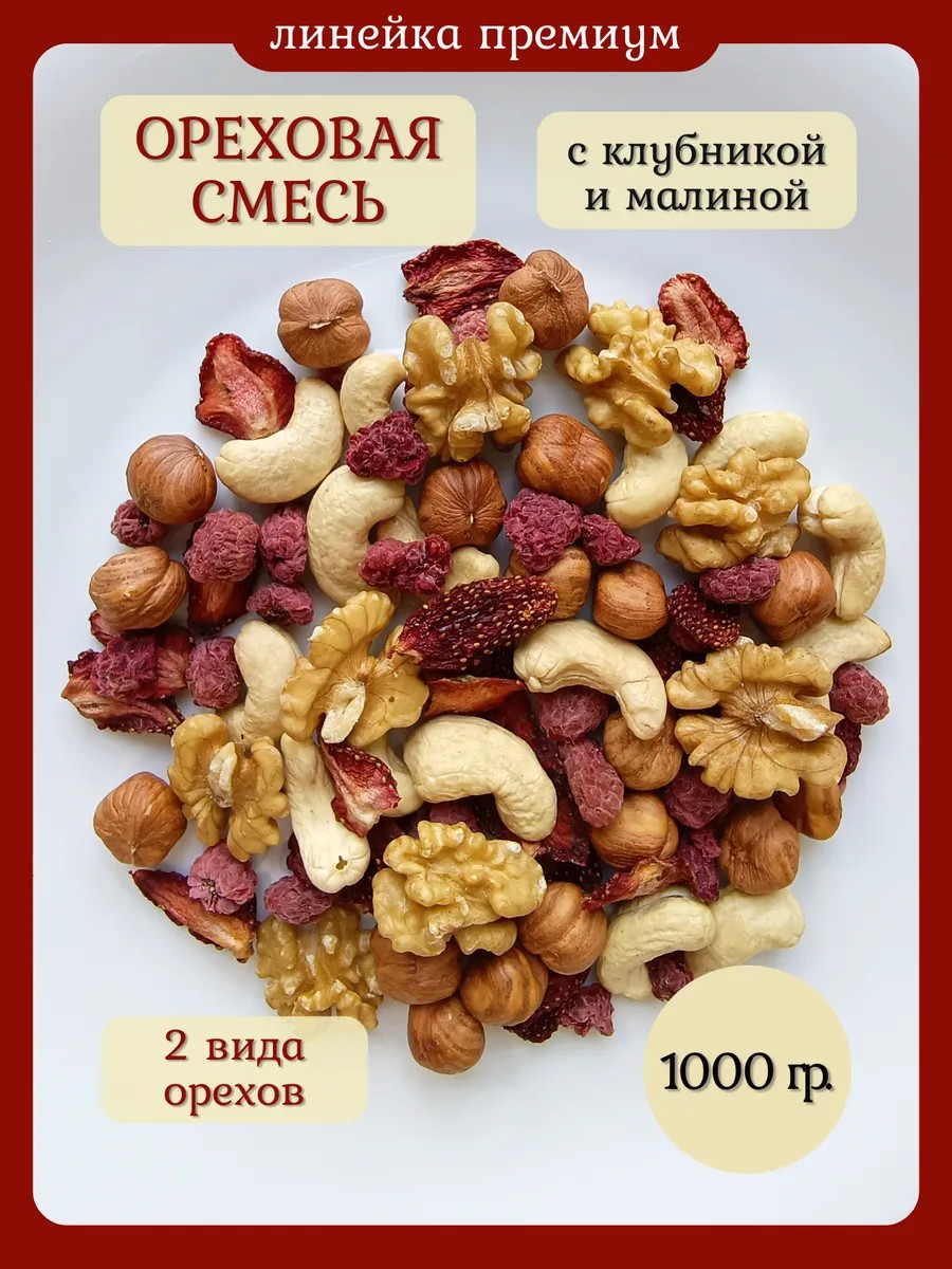 | Состав | Фундук сушеный; Кешью сушеный; грецкий орех; малина сушеная; клубника сушеная |