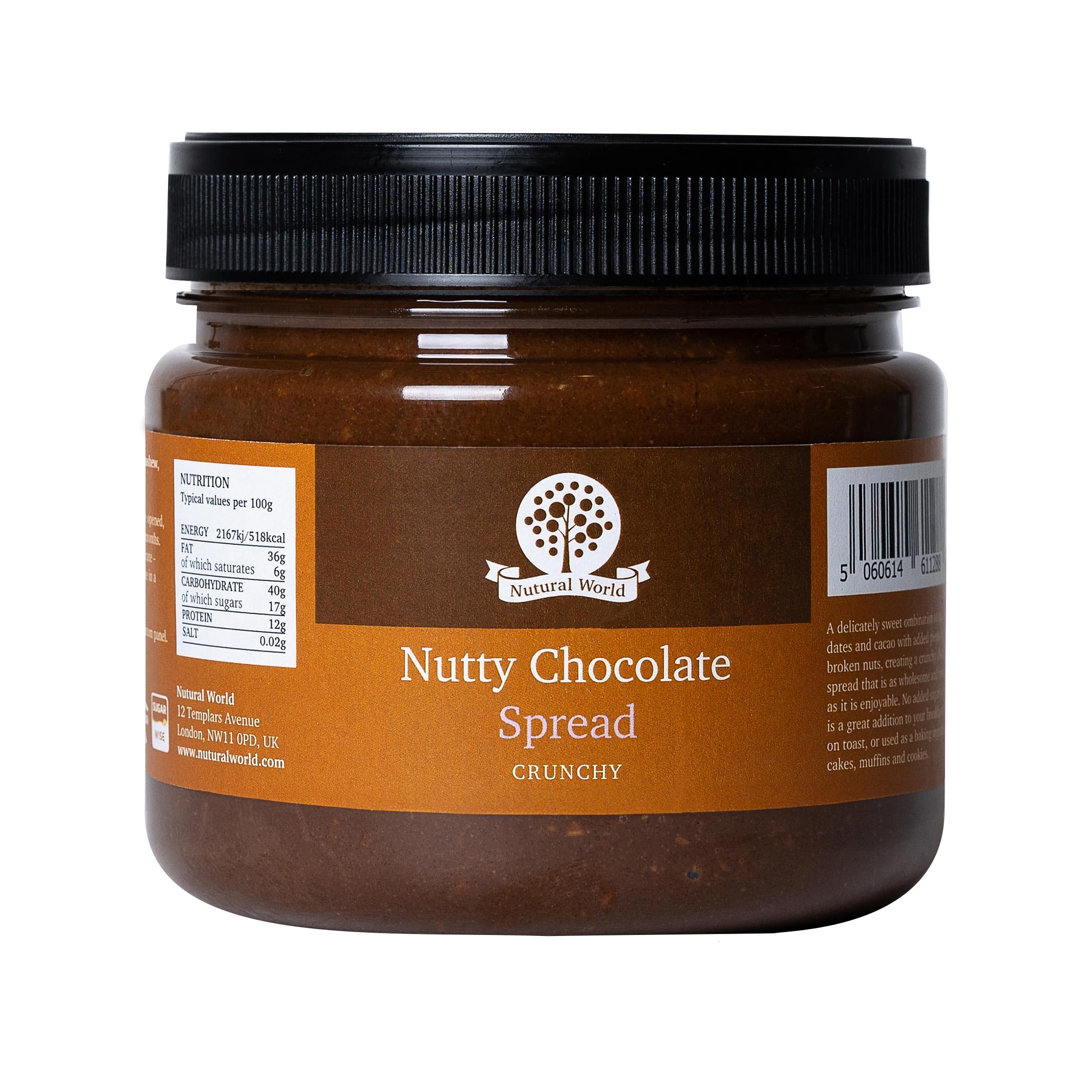 ARTISAN PRODUCER: Made in small batches, with love and care, by an artisan producer in the UK. WIDE APPEAL: Perfectly suited to vegan, vegetarian, paleo, and kosher diets, certified sugar-free, and made in a peanut-free facility. A favorite of many nut butter lovers. VERSATILE: Fabulous as a spread on crackers, on ice cream, used in baking, or simply on its own—spoon straight from the jar for guilt-free enjoyment. DELICIOUS: Exceptional aroma and texture, a comforting spread that would delight children and adults alike. ABSOLUTE PURITY: Few ingredients—no added harmful substances. Lightly roasted nuts, cocoa, and dates. No added sugar, sweeteners, salt, or oil (of any kind).PRODUCTEUR ARTISAN : Fabriqué en petits lots, avec amour et soin, par un producteur artisanal au Royaume-Uni. LARGE APPEL : Parfaitement adapté aux régimes végétaliens, végétariens, paléo et casher, certifié sans sucre et fabriqué dans une usine sans arachides. Un favori de nombreux amateurs de beurre de noix. POLYVALENT : Fabuleux comme tartinade sur des craquelins, sur de la crème glacée, utilisé pour la pâtisserie ou tout simplement seul – cuillère directement du pot pour un plaisir sans culpabilité. DÉLICIEUX : Un arôme et une texture exceptionnels, une pâte à tartiner réconfortante qui ravirait les enfants et les adultes. PURETÉ ABSOLUE : Peu d'ingrédients – sans aucun ajout de substances nocives. Noix légèrement torréfiées, cacao et dattes. Sans sucre, édulcorant, sel ou huile (de quelque nature que ce soit) ajoutés.Nutural World - Tartinade croquante au chocolat et aux noix (1 kg)