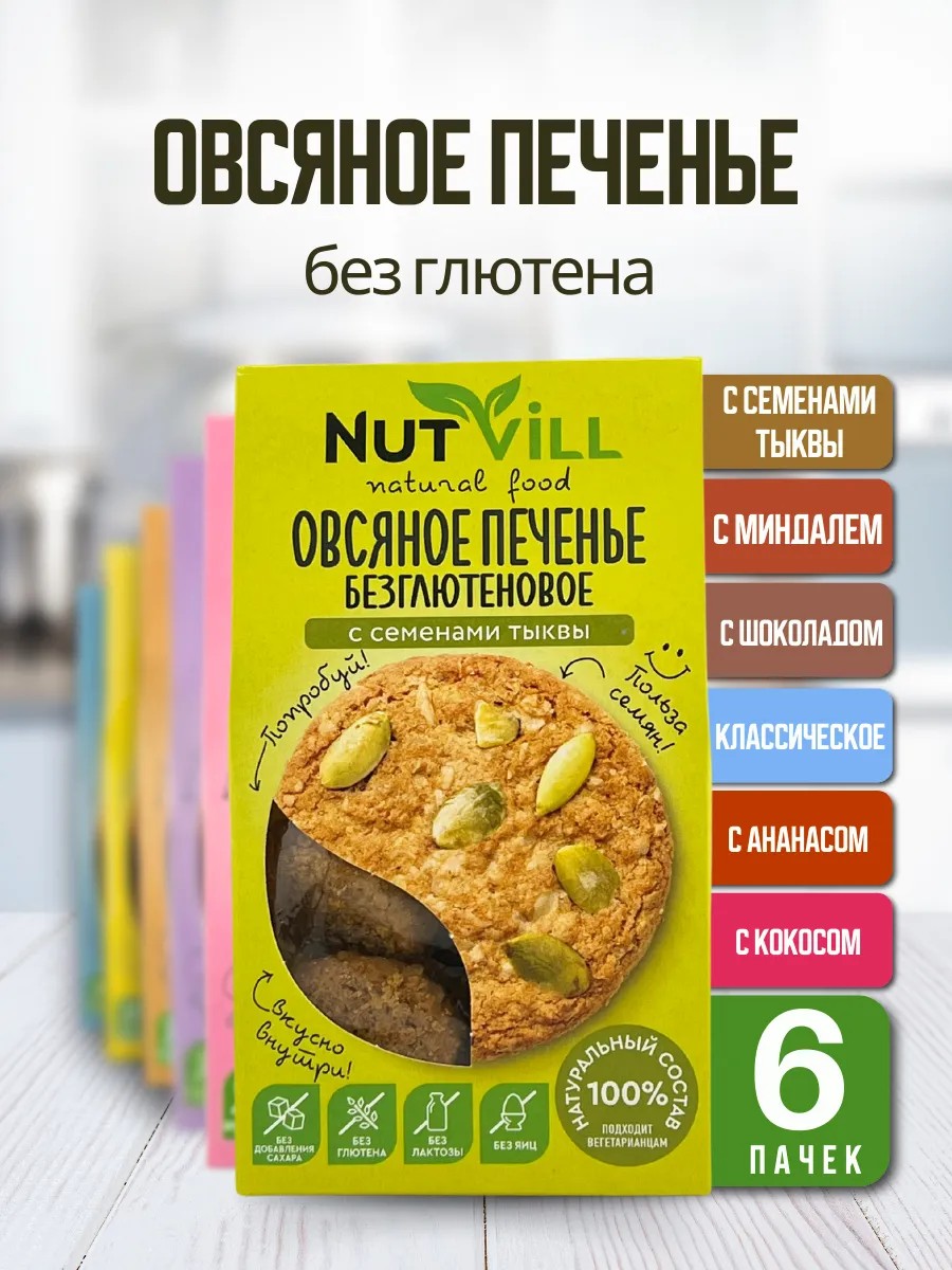 В ассортименте представлено 6 видов печенья: классическое, с семенами тыквы, с шоколадом, с миндалем, с кусочками ананаса и с кокосом. Овсяное печенье NutVill — это настоящее лакомство, которое не только порадует вас своим вкусом, но и принесёт пользу вашему здоровью.