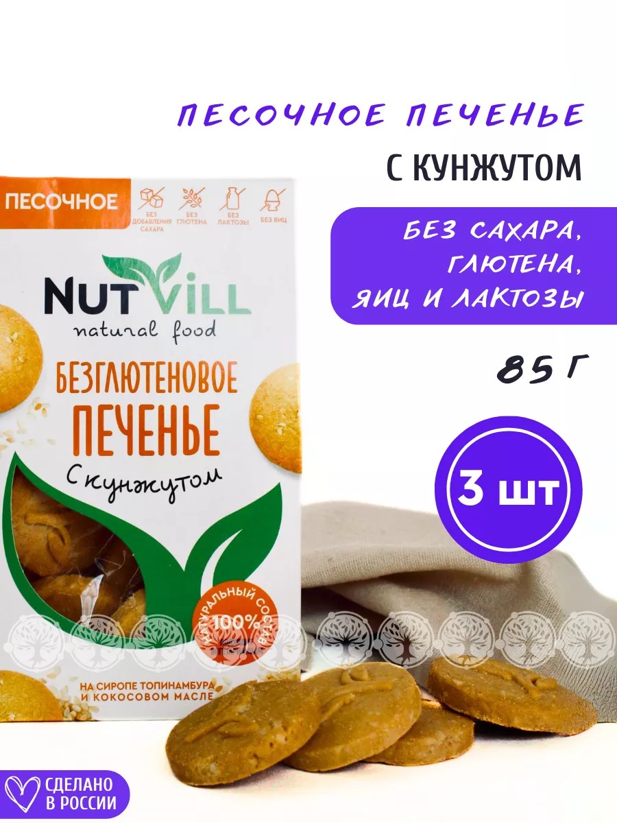 АЛЛЕРГЕНЫ: кунжут, возможны следы арахиса! Оригинальное песочное печенье без сахара NutVill доказывает, что сладости могут быть очень полезными и диетическими. При приготовлении выпечки не используется ГМО, консерванты и химические красители, благодаря чему можно утверждать, что продукция абсолютно безопасна. В составе печенья нет глютена, сахара, яиц и лактозы, оно подходит вегетарианцам. Рисовая и кукурузная мука - полезная основа печенья. Сироп топинамбура придает ему легкую сладость, которая понравится любителям спортивного печенья, фитнеса и женщинам на диете. Хлебобулочное изделие разрешено для детского питания.Такая мягкая выпечка станет хорошим быстрым перекусом для ребенка в садик или на школьный завтрак.