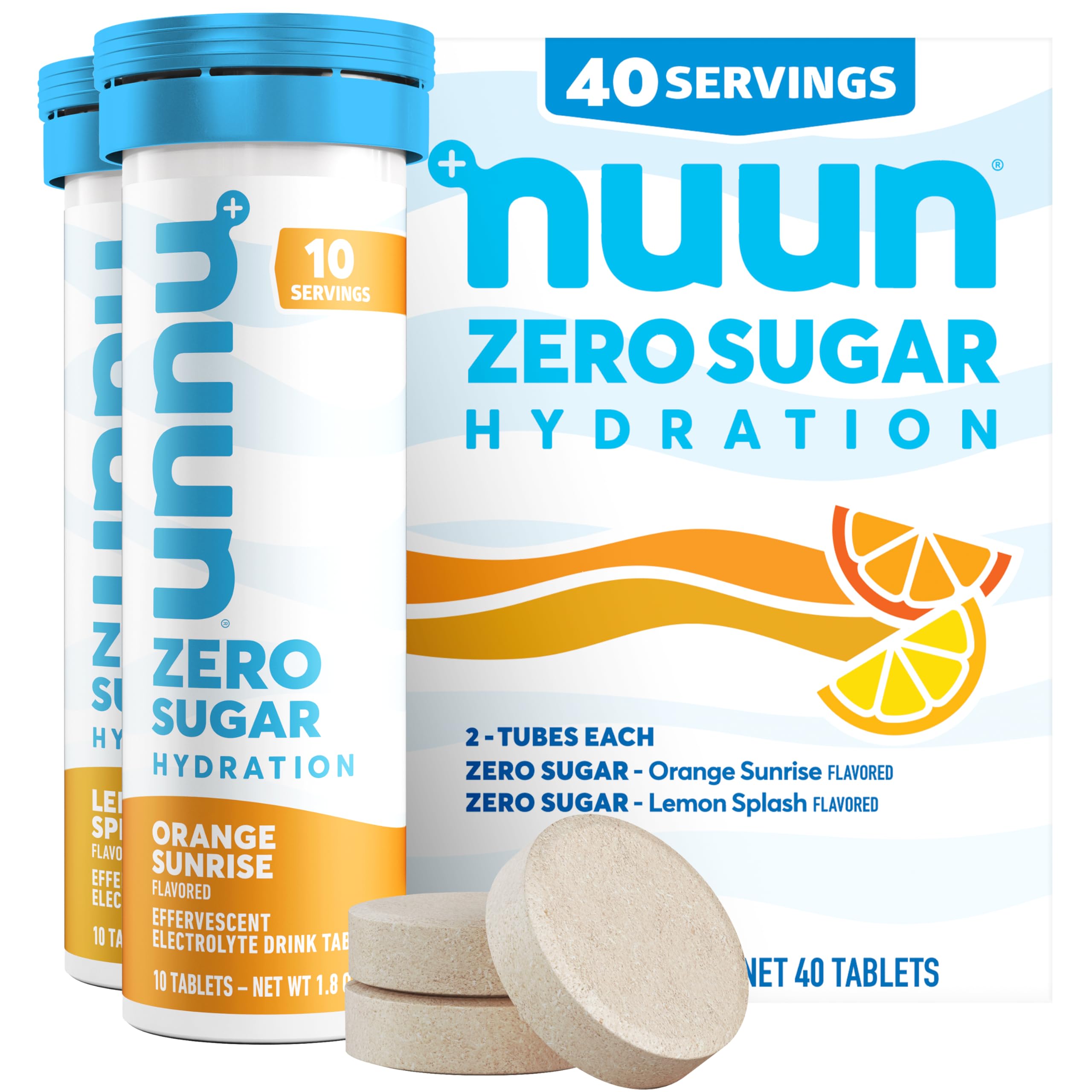 LIGHT, DELICIOUS FRUIT FLAVORS: Each Mixed Citrus 4-pack contains two (2) tubes of Orange Sunrise and two (2) tubes of Lemon Splash for a total of 40 servings Simply drop tablet in 16 fl oz of water, dissolve and enjoy. VEGAN, NON-GMO NO SUGAR: These electrolyte tablets are made with clean , plant-based ingredients and contain zero sugar for smart sipping all day, every day (1). 5 EVERYDAY ELECTROLYTES: These Nuun electrolyte tablets provide optimized quantities of Sodium (200 mg), Potassium (125 mg), Chloride (75 mg), Calcium (30 mg) and Magnesium (20 mg) to keep you hydrated during light movement or rest. FRESH NEW LOOK: Nuun Daily Hydration Tablets are now Nuun Zero Sugar the same great no sugar electrolytes you love have a new name and refreshed packaging (1). ZERO SUGAR ELECTROLYTES: Nuun Zero Sugar Hydration is an effervescent tablet for everyday hydration and water enhancement, made with essential electrolytes to keep you going and zero sugar to hold you back (1).