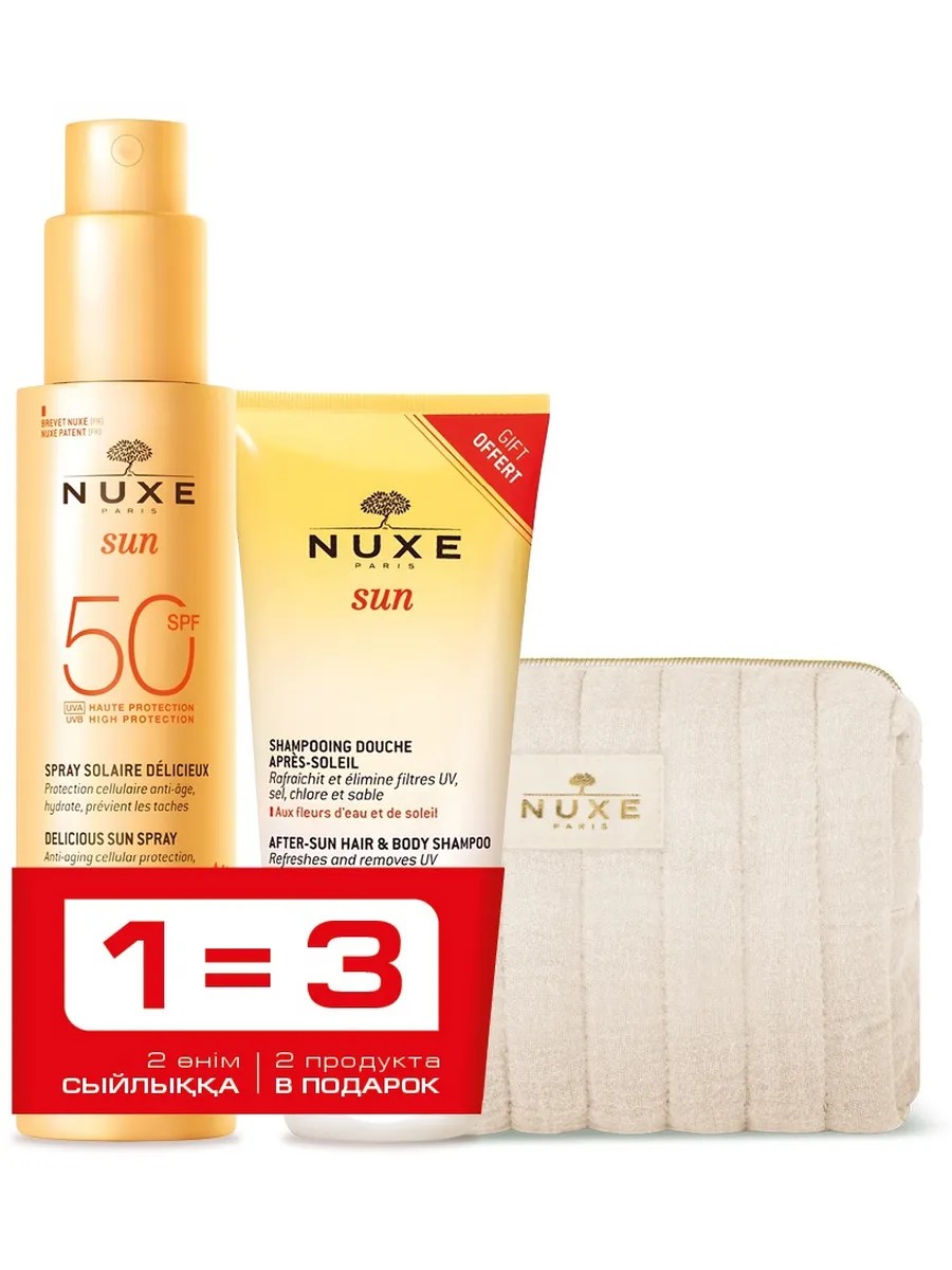 | Полное наименование товара | NUXE SUN Спрей солнцезащитный для лица и тела SPF 50 150мл + Шампунь-гель после загара 2 в 1 100 мл + Косметичка |