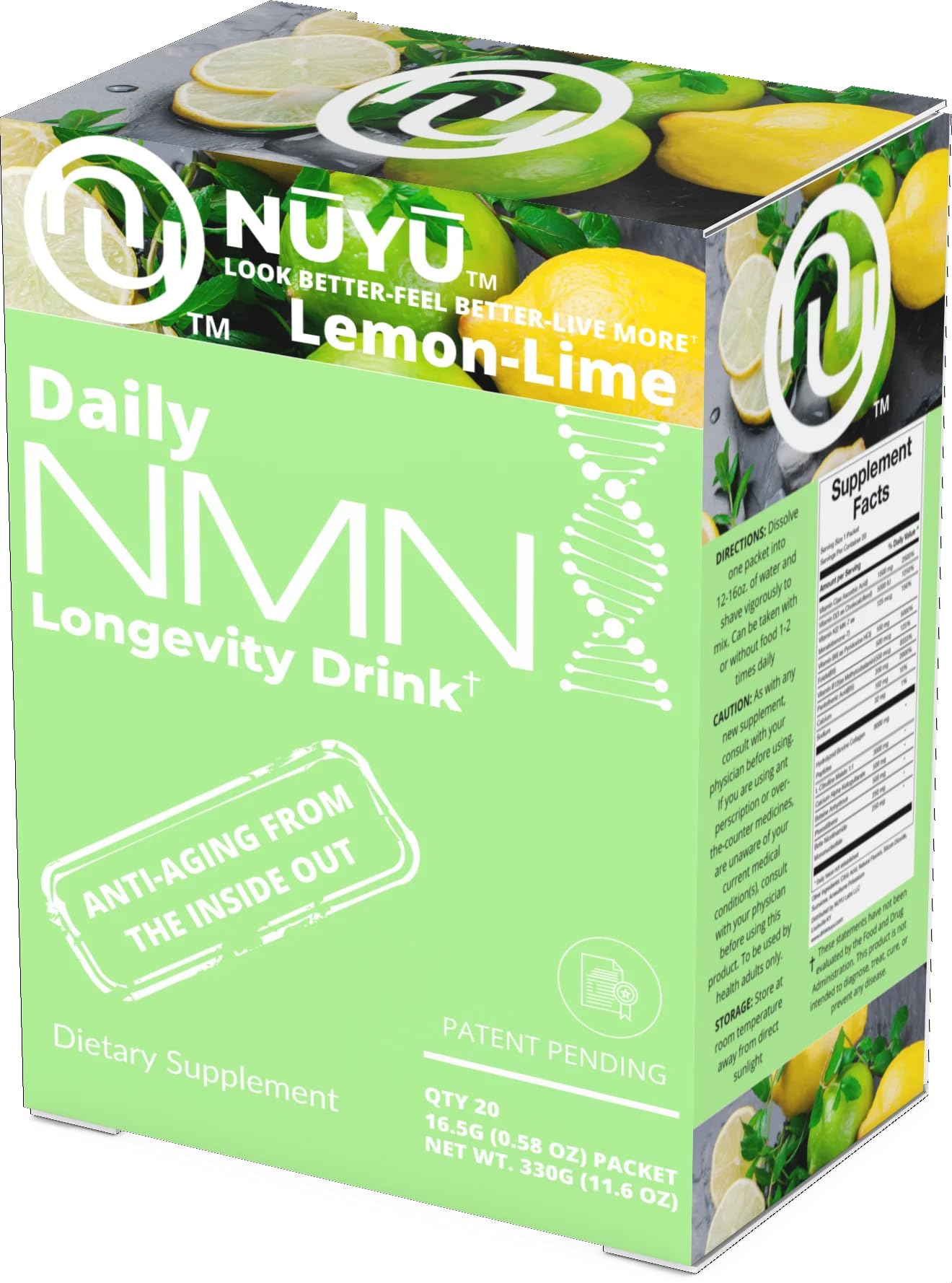 NUYU Daily NMN – Premium Longevity Drink Mix Rediscover everyday vitality with NUYU Daily NMN, a patent pending, next-generation cellular wellness drink designed to help you look, feel, and perform your best. Each serving blends cutting-edge ingredients that support natural energy production, cellular resilience, and youthful function—without the need for multiple pills or capsules. Key Benefits Supports Cellular Energy: Features NMN (ß-Nicotinamide Mononucleotide) and TMG to help maintain healthy NAD? levels—an essential coenzyme involved in energy metabolism and cellular renewal. Promotes Healthy Aging: Includes Calcium Alpha-Ketoglutarate (Ca-AKG) and Collagen Peptides to nourish connective tissue and support overall vitality as part of a balanced lifestyle. Powerful Antioxidant Support: Infused with Pterostilbene, a premium polyphenol 10x more biioavailable than Resveratrol, and a complete B Complex, plus vitamins C, D3, and K2-MK7 to help defend against oxidative stress and promote skin, bone, and immune health. Science-Inspired Formulation: Every ingredient is meticulously selected based on emerging longevity research. Research-Backed Ingredients: Active compounds have been thoroughly studied for their roles in supporting healthy aging, metabolic function, and overall vitality. Delicious Convenient: Mix one scoop with water for a refreshing, lightly flavored drink that fits perfectly into your daily routine. Why Choose NUYU? Unlike traditional capsules, NUYU delivers a comprehensive cellular wellness blend in a fast-absorbing drink format. Manufactured in the USA in cGMP-certified facilities, third-party tested for purity, and free from GMOs, gluten, and artificial colors. Look better. Feel better. Live more—with NUYU Daily NMN.MADE IN THE USA AND THIRD PARTY TESTED: All NUYU products are manufactured in the USA in cGMP Certified facilities. COMPREHENSIVE WELLNESS: Calcium AKG and essential vitamins create a complete longevity drink that supports cognitive function, cellular health, and overall vitality in a refreshing lemon lime flavor. PROMOTES SKIN ELASTICITY AND SUPPORTS HEALTHIER HAIR AND NAILS: Collagen peptides work synergistically with a specialized vitamin blend including B complex, Vitamin C, D3, and K2-MK7 to enhance skin elasticity and improve hair and nail health. PROMOTES CELLULAR HEALTH AND LONGEVITY: Patent-pending blend combines NMN with Pterostilbene to activate sirtuins and support healthy DNA, targeting key cellular pathways linked to healthy aging from within. NUYU Daily NMN contains Nicotinamide Mononucleotide that helps increase NAD levels which naturally decline with age, supporting cellular health and energy production.