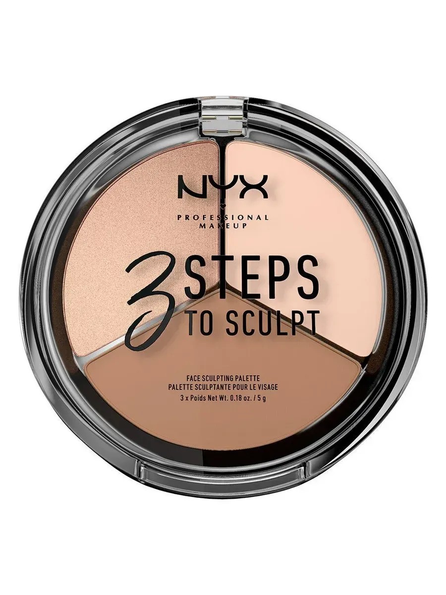 NYX 3 Steps to Sculpt Triple Sculpting Palette. Express your features like a pro with our NYX palette featuring essential sculpting products: powder, highlighter, and concealer. This dry-textured palette includes three highlighting and contouring shades perfect for enhancing your features. Coverage ranges from medium to full. Suitable for both beginners and experienced makeup users. This 3-in-1 face sculpting palette from NYX applies and blends easily. Enjoy natural beauty without the mask effect or effort! Suitable for normal, oily, dry, and combination skin. The texture is dense, dry, and pressed. Coverage ranges from medium to full. How to use: Apply the dark shade to the areas you want to highlight, the light matte shade to the areas you want to highlight, and the highlighter to the highest parts of the face.
