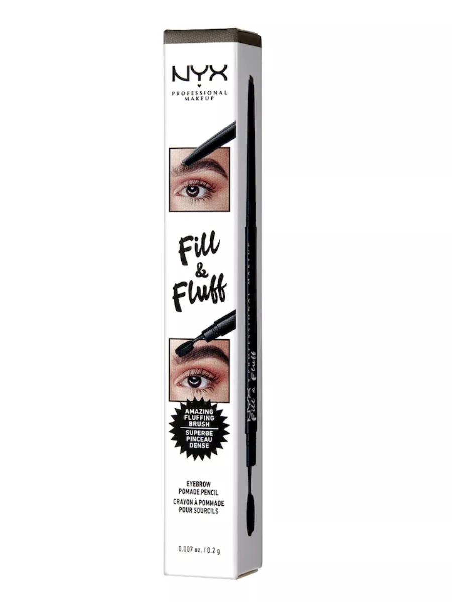 Fill & Fluff Eyebrow Pomade Pencil is a dual-ended pencil with a triangle-shaped tip for quick and easy brow filling, and a small brush for combing hairs and softly blending edges. The pencil has a soft, waxy texture and is available in eight pigmented matte shades. This 2-in-1 product allows you to easily achieve boyfriend-style brows and control their volume—exactly what you've been missing in your brow makeup and styling routine. For a perfect result, we recommend using it with NYX THE BROW GLUE brow gel.