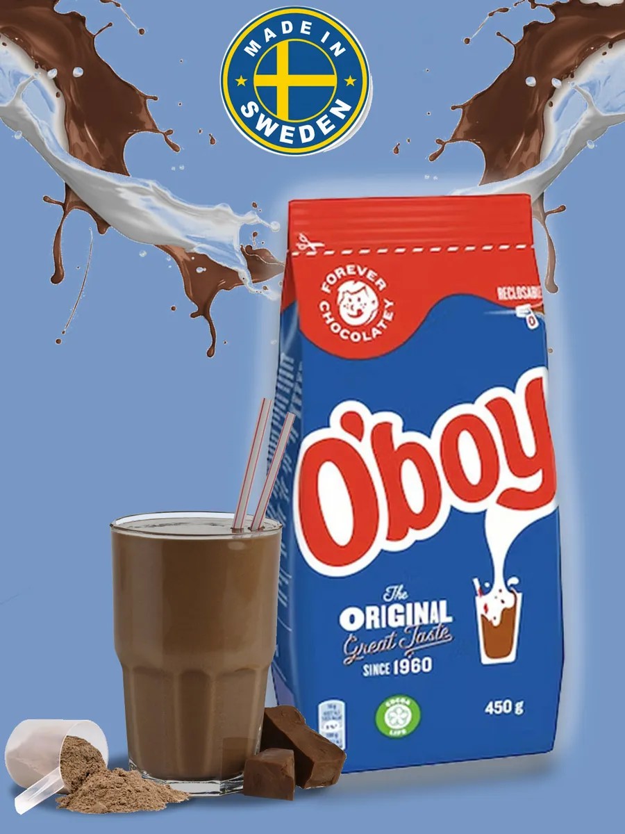 Oboy Original cocoa contains less sugar than other cocoa brands and is free of artificial sweeteners, making it healthy even for small children. Oboy dissolves easily even in cold water and can also be diluted with hot or cold milk. Directions: 3-4 heaped teaspoons of cocoa per 200 ml of cold or hot milk. Stir and drink. Oboy (Swedish for chocolate powder) is a certified cocoa brand. Ingredients: sugar, low-fat cocoa (18%), soy lecithin emulsifier, dextrose, salt, vanillin flavoring. Contains soy.