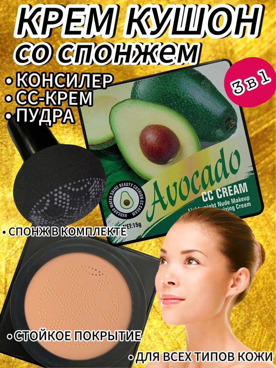 Тональный крем-кушон для лица CC-крем, в комплекте со спонжем - подходит для всех типов кожи, увлажняет, питает и матирует кожу лица, идеально перекрывает тёмные круги под глазами, убирает покраснения на лице, пигментацию и другие несовершенства. Кушон 3 в 1 ( тон 02 бежевый, натуральный ) - Ваш идеальный помощник. Крем подстраивается под Ваш тон кожи, при этом не пересушивает ее. Можно использовать как консилер. Тональный крем обеспечивает долговременный уход и увлажнение. Мягкая пуховка-спонж обеспечивает экономичный расход средства, обладает высокой покрывающей способностью. CC крем уникально скрывает любые высыпания, устраняет излишнюю пигментацию, покраснения, темные круги под глазами и другие несовершенства кожи, обеспечивая ровный естественный здоровый оттенок. Формула средства разработана с учетом потребностей всех типов кожи, поэтому Вы не будете беспокоиться о том, что он может забить поры или вызвать раздражение. Это легкий тональный крем тон 2, который подсушивает жирную кожу, но мягко увлажняет сухую кожу, сохраняя необходимое питание и увлажнение. Тоналка подходит не только для женщин девушек , но и девочек подростков с проблемной кожей. Кушон прекрасная косметика для макияжа женская. Премиум крем-кушон для лица - это идеальное решение для тех, кто хочет получить идеальный тон кожи. Косметика для всех - это отличный выбор для тех, кто хочет получить качественный уход за кожей и идеальный макияж. Помогает сохранить макияж свежим и стойким в течение всего дня. Способ применения кушона: Нанесите небольшое количество кушона на кожу лица, акцентируя внимание на проблемных зонах. Растушуйте консилер спонжем. Рекомендуется закрепить результат пудрой, для большей стойкости. корейская косметика. Отлично подходит для использования каждый день, для особых случаев, а также интересная идея подарка. Удобная, компактная и красивая упаковка, ее удобно брать с собой: в офис / на работу / поездки / путешествия, авокадо, консилер для лица, тональный крем.