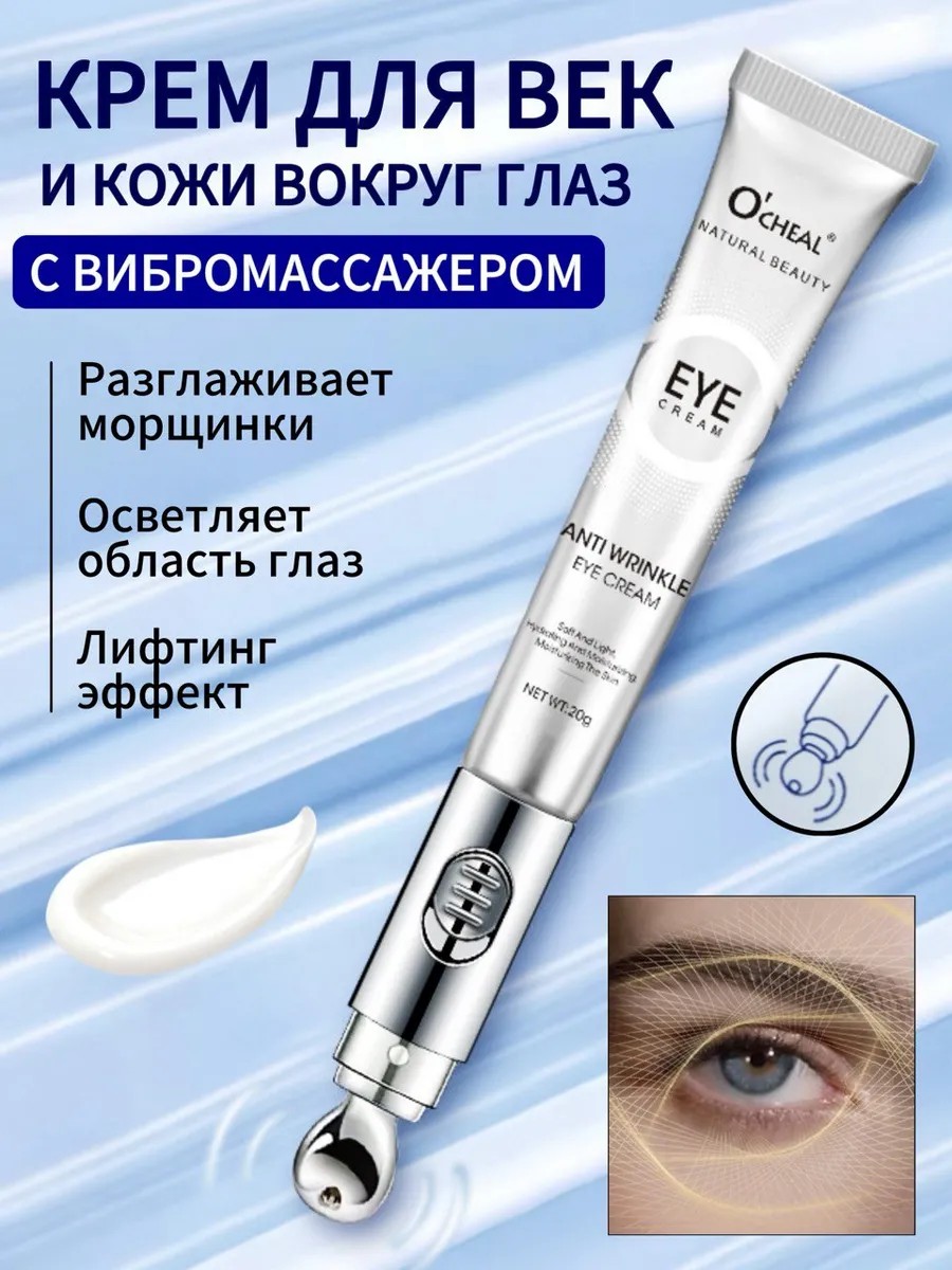 Крем для кожи кокруг глаз с аппликатором для легкого массажа O'cheal - это эффективное уходовое средство с антивозрастным лифтинг - эффектом. Крем для глаз с массажером с гиалуроновой кислотой и вибрационным массажем оказывает омолаживающий, подтягивающий и осветляющий эффект. Легкая вибрация улучшает кровообращение, укрепляет тонкую кожу век, снимает отеки, синяки и темные круги под глазами. Микродренаж специально разработан для нежной кожи вокруг глаз, изготовлен из специального холодного материала с охлаждающей головкой. В сочетании с кремом и экстрактом гиалуроновой кислоты великолепно омолаживает кожу и делает ее свежей и гладкой! Уникальная формула с ретинолом разработана по корейской технологии для борьбы с морщинками в области вокруг глаз. Косметический продукт комбинированного действия решает проблемы сухости и следов усталости: темных кругов, отеков и мешков под глазами, активно борется с признаками старения. Роликовый массажер стимулирует микроциркуляцию крови в кожных слоях, улучшает выполнение заданий каждой клетки эпидермиса. Косметика подходит для ухода за кожей в возрасте 30+, 40+, 50+ и 60+, обеспечивая видимый эффект лифтинга, увлажнения и питания. Состав средства обогащен ретинолом ( витамин А ), который улучшает тургор кожи и стимулирует обновление клеток, гиалуроновой кислотой ( увлажняет и питает, предотвращает потерю упругости ). Для применения наносите питательный крем на чистую кожу век легкими движениями. Увлажняющий и подтягивающий, восстанавливающий, разглаживающий и выравнивающий дерму продукт комплексного действия - это уникальный уходовый бьюти - ритуал для эффективной борьбы с мелкими и даже глубокими морщинами. Аппликатор с электрическим вибромассажером дарит коже легкий лимфодренажный массаж, который усиливает впитываемость крема и способствует омолаживающему и корректирующему несовершенства эффекту. Крем роллер - это удобное средство для ухода за кожей лица, разработанное специально для обладательниц комбинированной и жирной кожи. Несмываемый премиум - крем для глаз полезен для всех типов кожи, в т.ч. сухой и жирной, чувствительной, проблемной и возрастной. Увлажняющая эссенция полезна как для взрослых женщин и девушек, так и для мужчин, позволяет продлить молодость кожи без кардинальных косметологических процедур. Ароматный крем с нежной консистенцией легко наносится и быстро впитывается, увлажняет, приятно освежает и осветляет женскую или мужскую кожу вокруг глаз, придает ей гладкость и упругость, красивый тон. Средство может использоваться в качестве ночного и дневного, как база под макияж. Профессиональная продукция для увлажнения, питания и красоты кожи поставляется в тюбике с вибро - роликом ( объем 20 мл ). Это отличный подарочный вариант для сестры, коллеги и лучшей подруги.