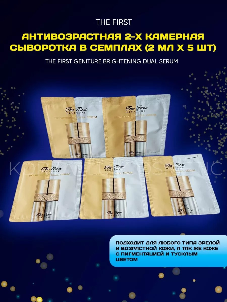 Представляем косметический набор косметики для лица O HUI Антивозрастная 2х камерная сыворотка в семплах (5шт по 2мл) The First Geniture Brightening Dual Serum. Уходовый набор для умывания лица Корея премиум класса содержит две камеры сыворотки, которые помогут вам достичь молодого и здорового вида кожи. Для поддержания чистоты рецептуры сыворотка была создана в разных камерах. Первая камера, выполненная в золотистом цвете, содержит осветляющую сыворотку, которая помогает сделать вашу кожу яркой, чистой и сияющей, устраняя пигментацию и неровный тон. Она также способствует выравниванию текстуры кожи и улучшению ее общего состояния. Сыворотка с интенсивной формулой одновременно борется с возрастной пигментацией, тусклостью и раздражением и способствует омоложению. Сыворотка в золотой камере осветляет пигментные пятна и следы пост акне. Увлажняет, питает и разглаживает кожный рельеф . Обладает антиоксидантным действием. Имеет блестящую текстуру: увлажняющее белоснежное молочко с блестящим и влажным финишем и с отличными впитыванием. Вторая камера, выполненная в голубом цвете, содержит успокаивающую сыворотку. Эта сыворотка обладает увлажняющими и питательными свойствами, которые помогут снять сухость, шероховатость, смягчить кожу и устранить ощущение стянутости. Успокаивающая сыворотка также снимает раздражение и уменьшает покраснение, обеспечивая комфорт и ухаживая за вашей кожей. Текстура из голубой камеры полупрозрачная более жидкая, без липкости.