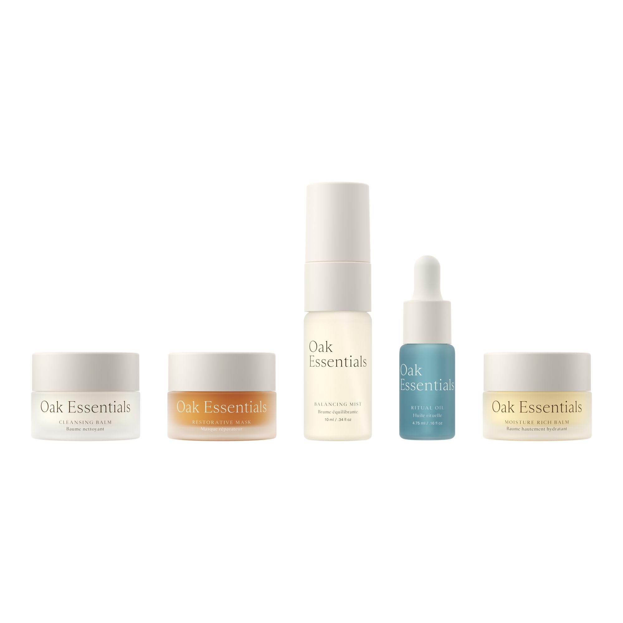 Oak Essentials Mini Routine | Clean Hydrating Travel-Size Set with Cleanser Mask Balm Oil & Toner 5 Count Multicoloured