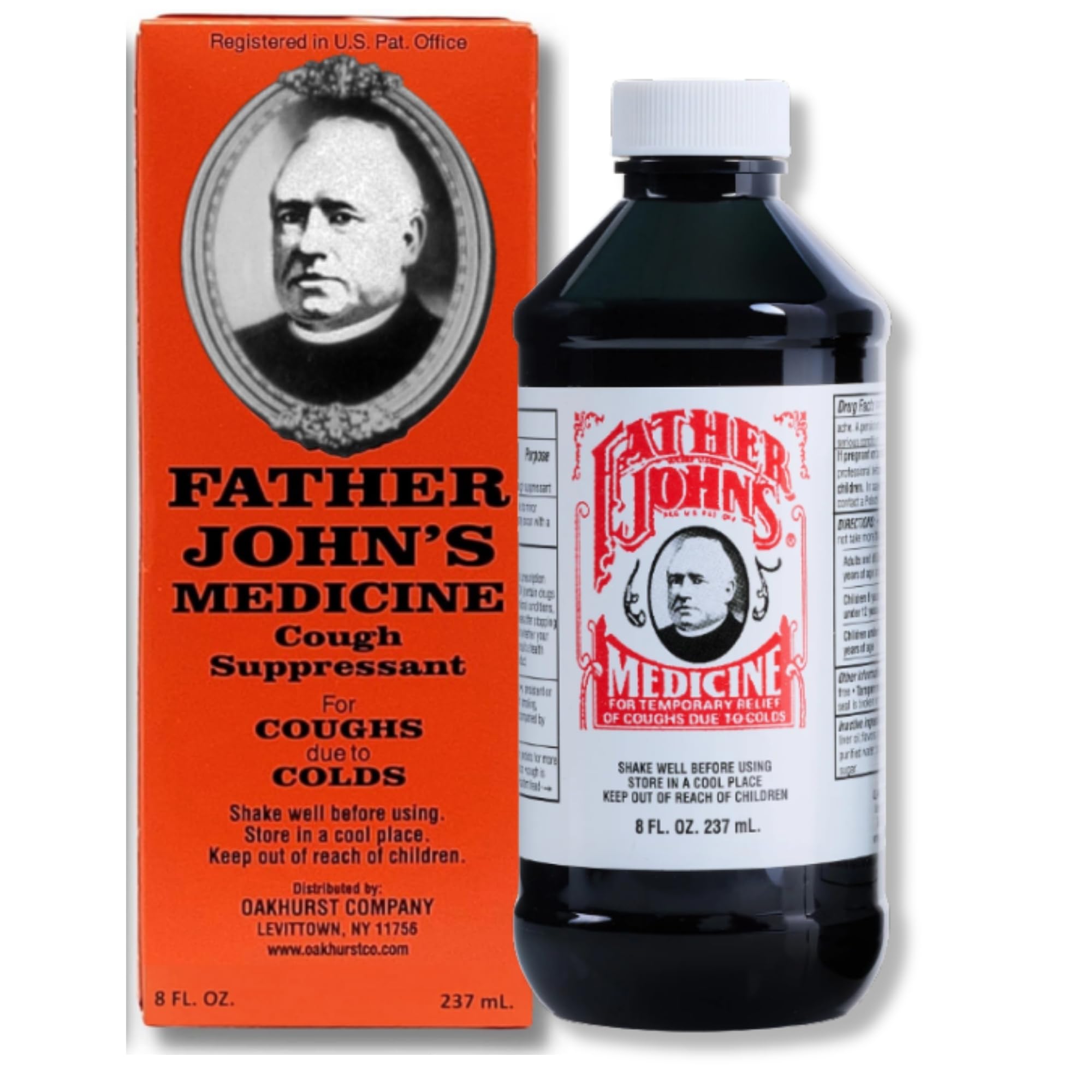 Father John's Cough Medicine, trusted since 1855, is an alcohol-free, non-habit-forming elixir that relieves coughs with 10mg of Dextromethorphan HBr per teaspoon. This herbal syrup features licorice and cod-liver oil for added benefits. Oakhurst Company continues to offer this timeless remedy.
