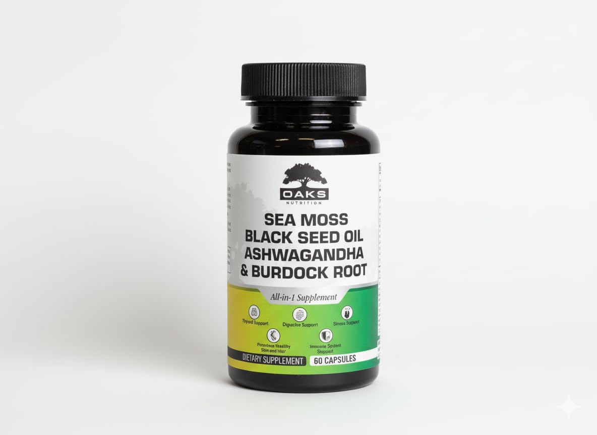 Oaks Nutrition Sea Moss, Black Seed Oil, Ashwagandah Burdock Root