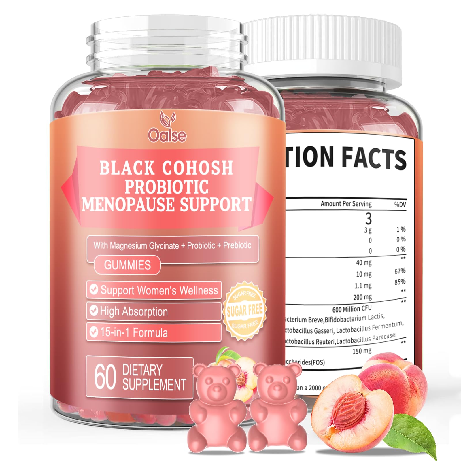OALSE Menopause Supplement for Women Gummies with Black Cohosh Magnesium Vitamin E Probiotic & Prebiotic - Hot Flashes* and Night Sweats* Relief Supplements - Vegan Peach Flavored 60 Counts