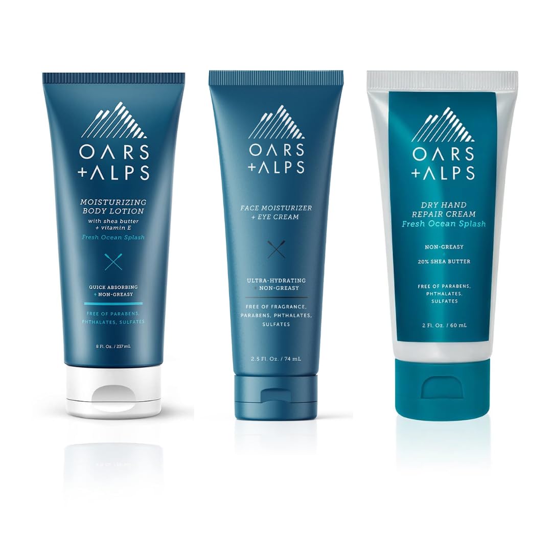 PREMIUM, GOOD-FOR-YOU INGREDIENTS: We thoughtfully curate each ingredient to keep you fresh and moisturized. They're vegan, animal cruelty-free and dermatologist-tested. We never use sulfates, alcohol, parabens, phthalates or talc. BODY LOTION: Deeply hydrate your dry skin without feeling heavy or greasy Provides intense moisture for dry and dehydrated skin. DRY HAND REPAIR CREAM: Soothes and repairs dry hands without leaving them greasy Deeply hydrates and heals skin. FACE AND EYE CREAM: Powerful hydrating and anti-aging face moisturizer and eye cream with proven antioxidant properties, preventing wrinkles and soothing and replenishing skin. HYDRATION BUNDLE: Includes Oars Alps Face Moisturizer and Eye Cream, Hand Repair Cream, and Body Lotion.
