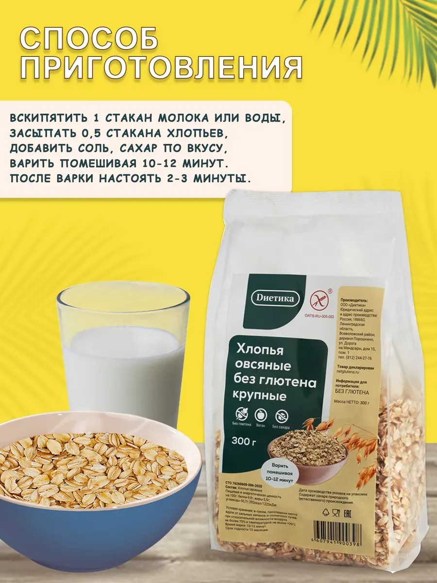 'Хлопья овсяные крупные без глютена 'Диетика' 300 гр (2 шт. в комплекте)' 'Диетика' - это высококачественные овсяные хлопья, изготовленные из натурального сырья на европейском оборудовании. Они не содержат глютена и обладают всеми необходимыми сертификатами качества. Срок годности продукта составляет 365 дней. Овсянка является одним из самых полезных продуктов для здоровья. Протеины и клетчатка в овсянке улучшают обменные процессы в организме, способствуют росту и развитию мышечной ткани. Также овсянка очищает кишечник от шлаков и токсинов, стимулирует работу пищеварительной системы, помогает предотвратить риск развития рака и хронических заболеваний желудочно-кишечного тракта. Благодаря богатому содержанию биотина (витамина группы В), овсянка способствует улучшению состояния кожи и предотвращает развитие дерматитов. Углеводы в овсянке являются медленными, что обеспечивает постепенное поступление энергии в организм и сохранение сытости на длительное время. Упаковка содержит 2 штуки по 300 грамм каждая. Продукт упакован в пакет и произведен на Российском оборудовании.Хлопья овсяные 'Диетика' - отличный выбор для здорового и сбалансированного питания.