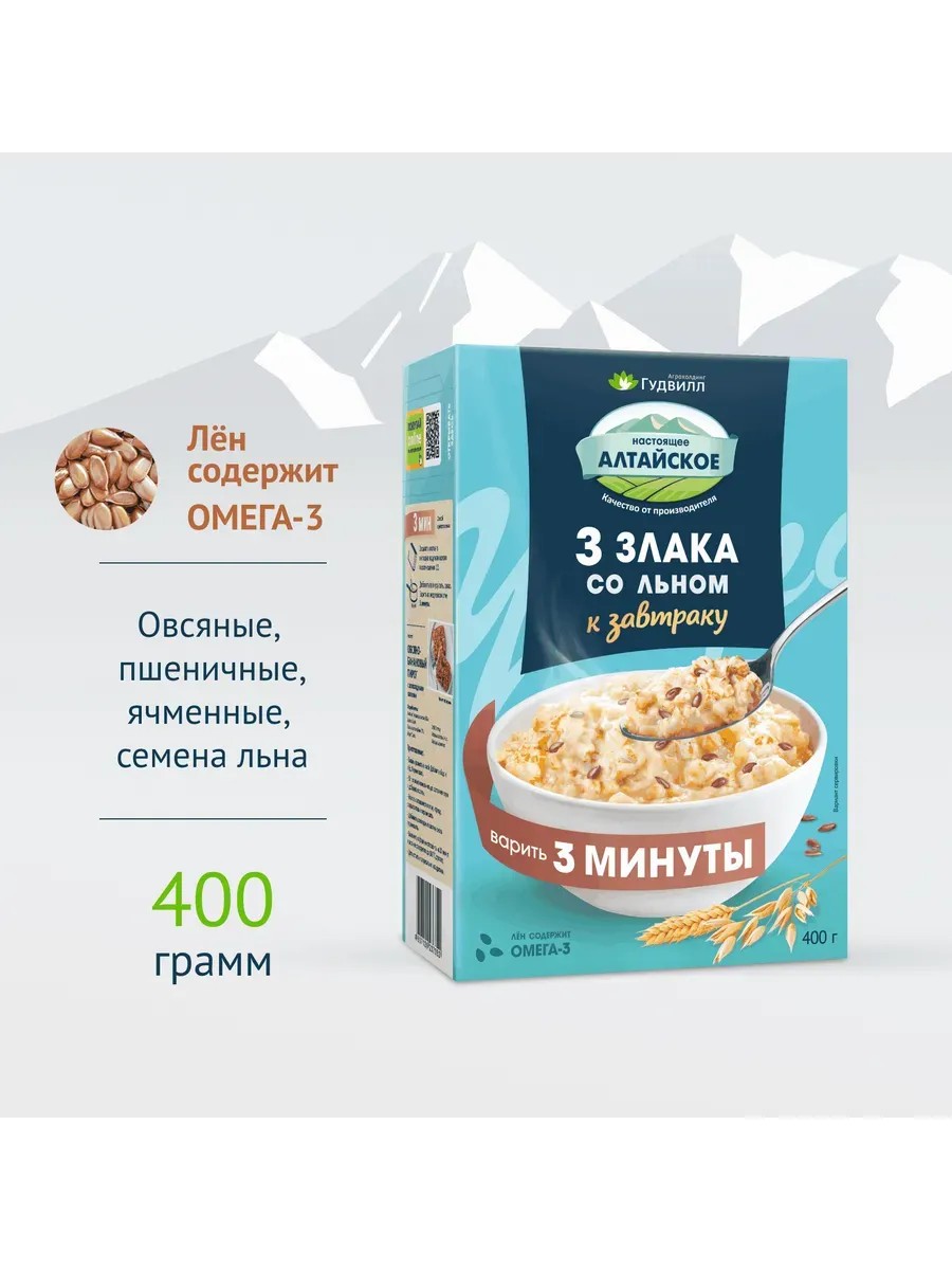 Goodwill wheat and barley oat flakes with flaxseed. These oat flakes are excellent instant cereals and porridges without additives. Recommended for diabetics, they are also suitable as a dietary Lenten vegetarian meal. A delicious breakfast set for the microbiota. They detoxify the body, are low in gluten, and are suitable for babies 12 months and older. This cereal mix is an excellent side dish and can be made with or without dairy. Multigrain cereals will improve your digestion and bowel function and will be a lifesaver during Lent, at work, at the dacha, or while traveling. Regular consumption prolongs youth and improves health. These aromatic and thick cereals contain a large amount of dietary fiber, which promotes weight loss and normalizes fat and lipid metabolism. Free of salt, dyes, flavorings, and additives. We also recommend bagged cereals, a mix of grains and legumes. Good food, healthy products, a healthy lifestyle, and proper nutrition. Whole grains from Altai, Mistral, Yasno Solnyshko, Nordic, Uvelka, Makfa, Kubanskaya Kukha, Yarmarka, Agro Alliance Extra. We recommend buckwheat, millet, and corn rice.