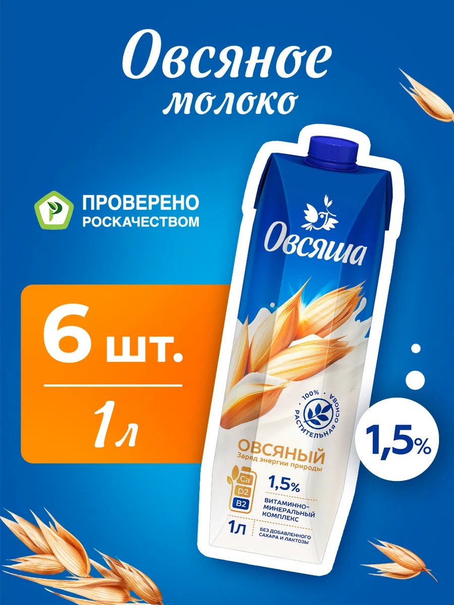 Овсяное молоко Овсяша - легкий натуральный растительный продукт питания для замены коровьего молока. Подходит для питания детей с 3 лет. БЕЗ САХАРА, без лактозы, без консервантов, без ГМО и усилителей вкуса. Овсяное молоко 1 литр - отличный продукт для повседневного употребления в пищу. Легкие растительные жиры не повредят вашей фигуре и помогут разнообразить меню, а витамины и минералы, входящие в состав напитка, восполнить дефициты. Овсяный безлактозный напиток на основе отборного овса можно использовать для приготовления постных блюд, веганский кексов и полезных сладостей без сахара. Овсяное молоко идеально и для barista - его можно смело добавить в кофе для капучино, чай или какао. Веганский напиток отлично подойдет в качестве ингредиента в овощной крем-суп, десерт или фруктовый коктейль. Идеален для ЗОЖ, спорта, диеты, поста. Вы можете купить удобный формат упаковки Тетра Пак 1 литр с пониженной жирностью 1,5% для всей семьи. Овсяша - это не молоко животного происхождения, а 100% альтернативное растительное молоко без холестерина для себя, семьи или бариста. Овсяша также и детское молоко - подходит для питания детей с 3 лет. Поставляется в коробках по 6 штук.