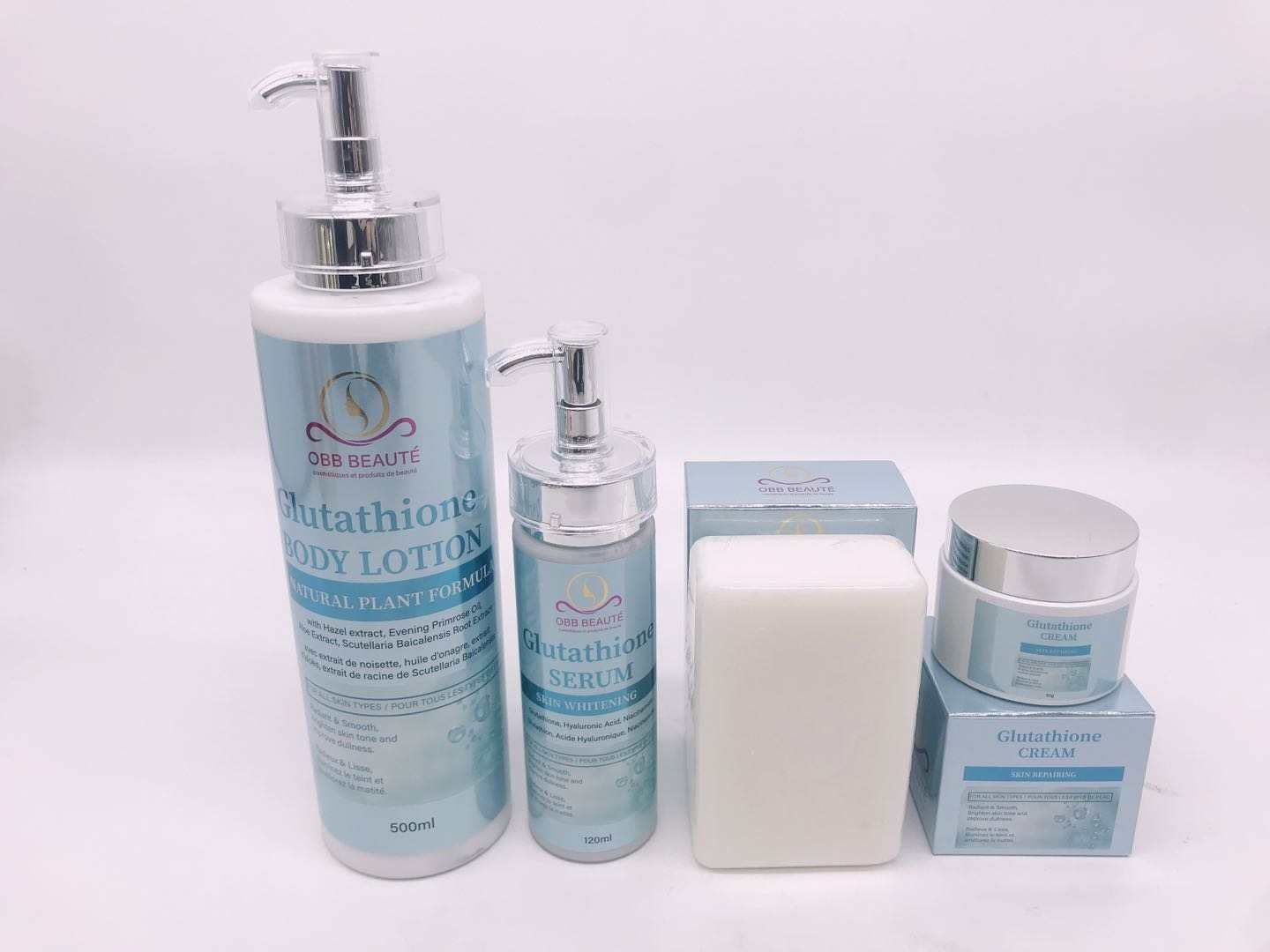 A range with natural plant-based ingredients for radiant, smooth skin. A luminous complexion with a matte finish. Suitable for all skin types. Lotion 500ml, Face Serum 120ml, Face Cream 50g, Soap 250g. Need help? Obbbeauté's Glutathione Complexion Illuminating range is specially designed for all skin types. It aims to brighten the complexion, even out skin tone, and give it a natural glow. The products in this range contain glutathione, a powerful antioxidant known for its brightening and anti-aging properties. The Glutathione Complexion Illuminating range includes a cleanser, a toner, a serum, and a moisturizer. Each product is carefully formulated to deliver visible and lasting results. The cleanser gently removes impurities and traces of makeup, while preparing the skin to receive the benefits of the other products in the range. The toner helps balance the skin's pH and tighten pores, while providing light hydration. The serum is the key product in the range. It's enriched with glutathione and other brightening ingredients to target dark spots, hyperpigmentation, and uneven skin tone. It helps even out skin tone and gives it a luminous, radiant appearance. The moisturizer completes the routine by providing deep hydration and protecting the skin from environmental aggressors. It also helps maintain the skin's radiance and suppleness throughout the day. Obbbeauté's Glutathione Brightening Skincare range is formulated without parabens or harsh ingredients, making it suitable for all skin types, including sensitive skin. However, it's always recommended to perform a patch test before using any new product.Complexion illuminating range.GAMME GLUTATHIONE ILLUMINATRICE DE TEINT POUR TOUS TYPES DE PEAUX (lait 500ml, serum pour le visage 120ml, crème visage 50g, savon 250g)DESCRIPTION DU PRODUIT Gamme aux plantes naturelles pour une peaux radieuse et lisse. Un teint illuminé avec une grande matité .Gamme pour tous types de peau. Lait 500ml Serum visage 120 ml Creme visage 50g Savon 250g. aider? La gamme Glutathione Illuminatrice de Teint d'Obbbeauté est spécialement conçue pour tous les types de peau. Elle vise à éclaircir le teint, à uniformiser la peau et à lui donner un éclat naturel. Les produits de cette gamme contiennent du glutathione, un antioxydant puissant connu pour ses propriétés éclaircissantes et anti-âge. Les produits de la gamme Glutathione Illuminatrice de Teint comprennent un nettoyant, une lotion tonique, un sérum et une crème hydratante. Chaque produit est formulé avec soin pour offrir des résultats visibles et durables. Le nettoyant élimine en douceur les impuretés et les traces de maquillage, tout en préparant la peau à recevoir les bienfaits des autres produits de la gamme. La lotion tonique aide à équilibrer le pH de la peau et à resserrer les pores, tout en apportant une hydratation légère. Le sérum est le produit clé de la gamme. Il est enrichi en glutathione et en autres ingrédients éclaircissants pour cibler les taches sombres, les hyperpigmentations et les irrégularités du teint. Il aide à uniformiser la peau et à lui donner un aspect lumineux et radieux. La crème hydratante complète la routine en apportant une hydratation en profondeur et en protégeant la peau des agressions extérieures. Elle aide également à maintenir l'éclat et la souplesse de la peau tout au long de la journée. La gamme Glutathione Illuminatrice de Teint d'Obbbeauté est formulée sans parabènes ni ingrédients agressifs, ce qui la rend adaptée à tous les types de peau, y compris les peaux sensibles. Cependant, il est toujours recommandé de faire un test de sensibilité cutanée avant d'utiliser tout nouveauGamme illuminatrice de teint.