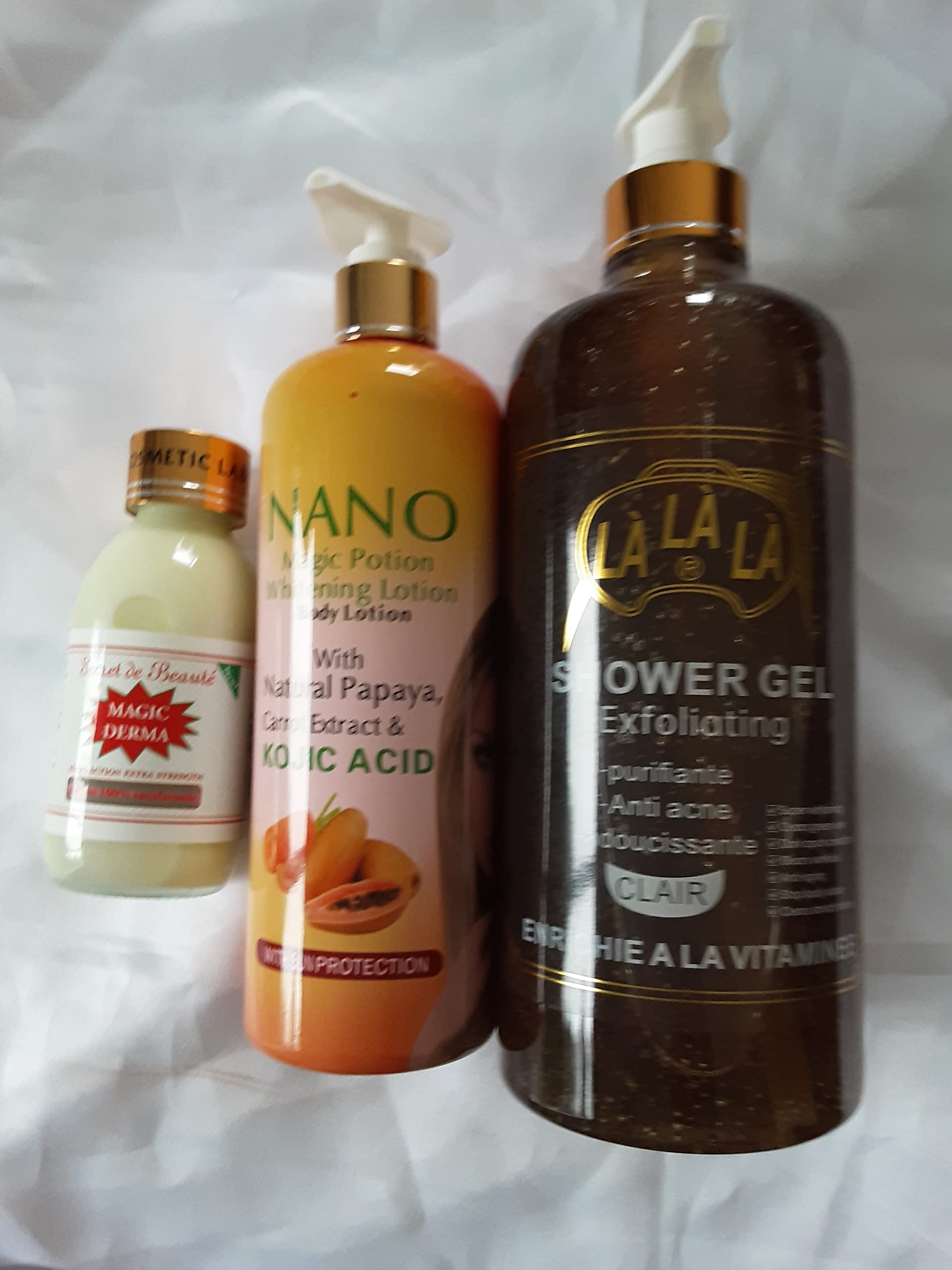 Nano Milk brightens, purifies, and hydrates the skin. Rich in vitamins A and E, this milk preserves your youthful skin, softens, refreshes, and makes it so much more radiant. It also helps eliminate certain skin imperfections while brightening. USE ON CLEAN SKIN MORNING AND EVENING. The Secret Beauty Concentrate, Magic Derma Super Brightening, Anti-Spot, Anti-Acne, Anti-Wrinkle, is very effective and should be used directly on a clean face morning and evening. It can also be mixed with the milk. LA LA LA Brown Shower Gel exfoliates, purifies, and softens the skin. It is also anti-acne and anti-dark and red spots. And above all, it is whitening and moisturizing.Nano milk, la la la shower gel, MAGIC DERMA concentrate.Gamme blanchissante éclaircissante : lait nano 500ml, serum magic derma 120ml, gel douche lalala marron 1000mlDESCRIPTION DU PRODUIT Le lait nano éclaircit, purifie et hydrate la peau. Riche en vitamine A et E , ce lait préservé votre peau de jeunesse, adoucit , rafraîchit et la rend tellement plus éclatante. Et il permet d éliminer certaines imperfections sur la peau tout en éclaircissant. A UTISER SUR UNE PEAU PROPRE MATIN ET SOIR Le concentré secret de beauté , magic derma super éclaircissante, anti-tache , anti acné, anti-rides , très efficace est utiliser directement sur le visage bien propre matin et soir, peut être mélanger au lait aussi Le gel douche LA LA LA marron exfolit la peau, la purifie et l adoucit. C est aussi un anti acnés , anti-tache noires et rousses. Et dessus de tout il est blanchissant et hydratantLait nano, gel douche la la la , concentré MAGIC DERMA.