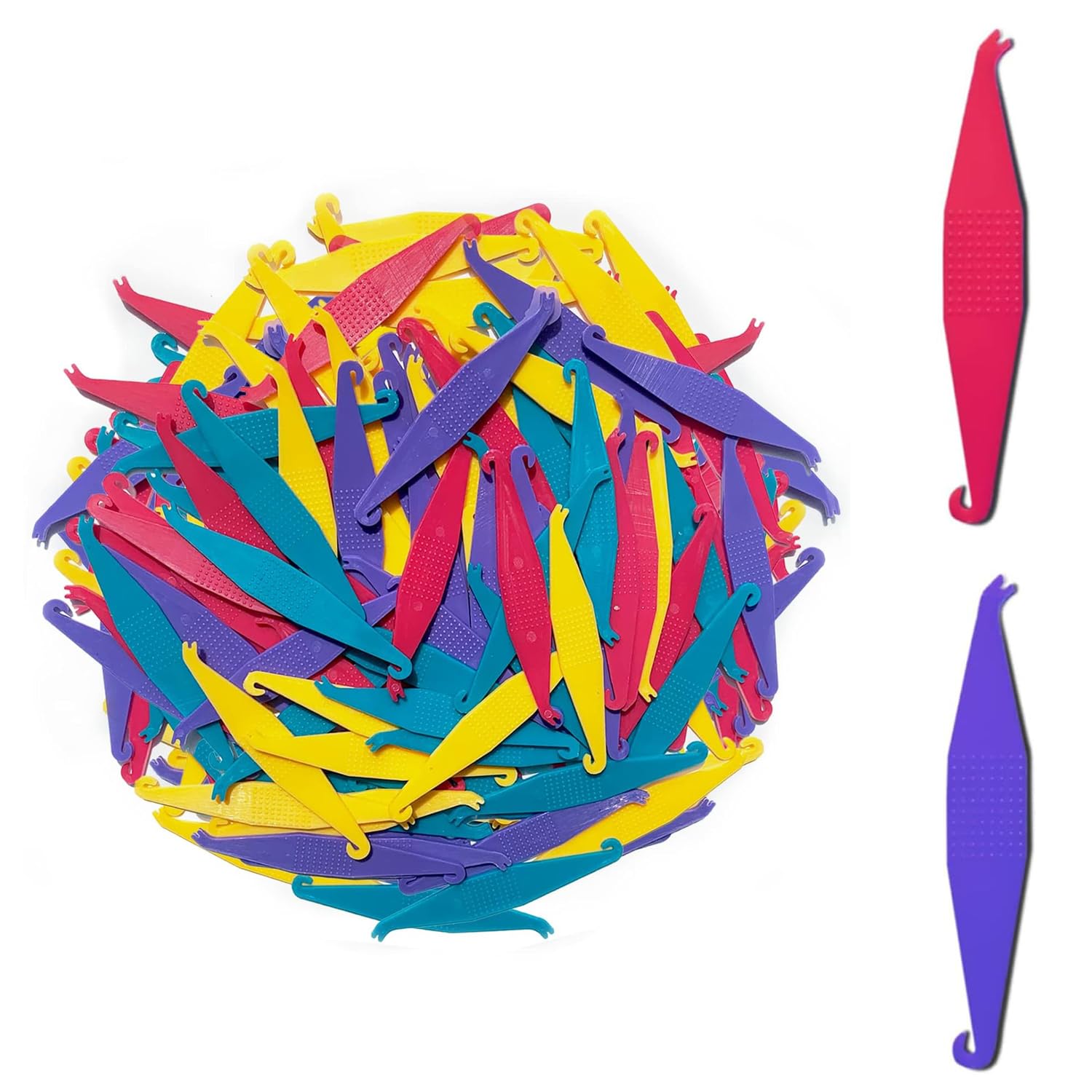 You will get 100 Pcs mixed color elastic rubber bands placers, enough to meet your daily needs. The rubber band placer can help you easily fit or remove the elastic band on the bracket. Great gadget. The size of the rubber bands placer is 2.4 inches, small and light, easy to carry. It can be put into wallet, backpack, pocket, etc. Elastic placer is a 2-in-1 design. One end is a hook for stretching and installing the rubber band, One end is a hook for stretching and installing the rubber band, and the other end is a push rod for removing the elastic rubber. The rubber bands placers are made of high-quality plastic, non-toxic and harmless, can be used with confidence.