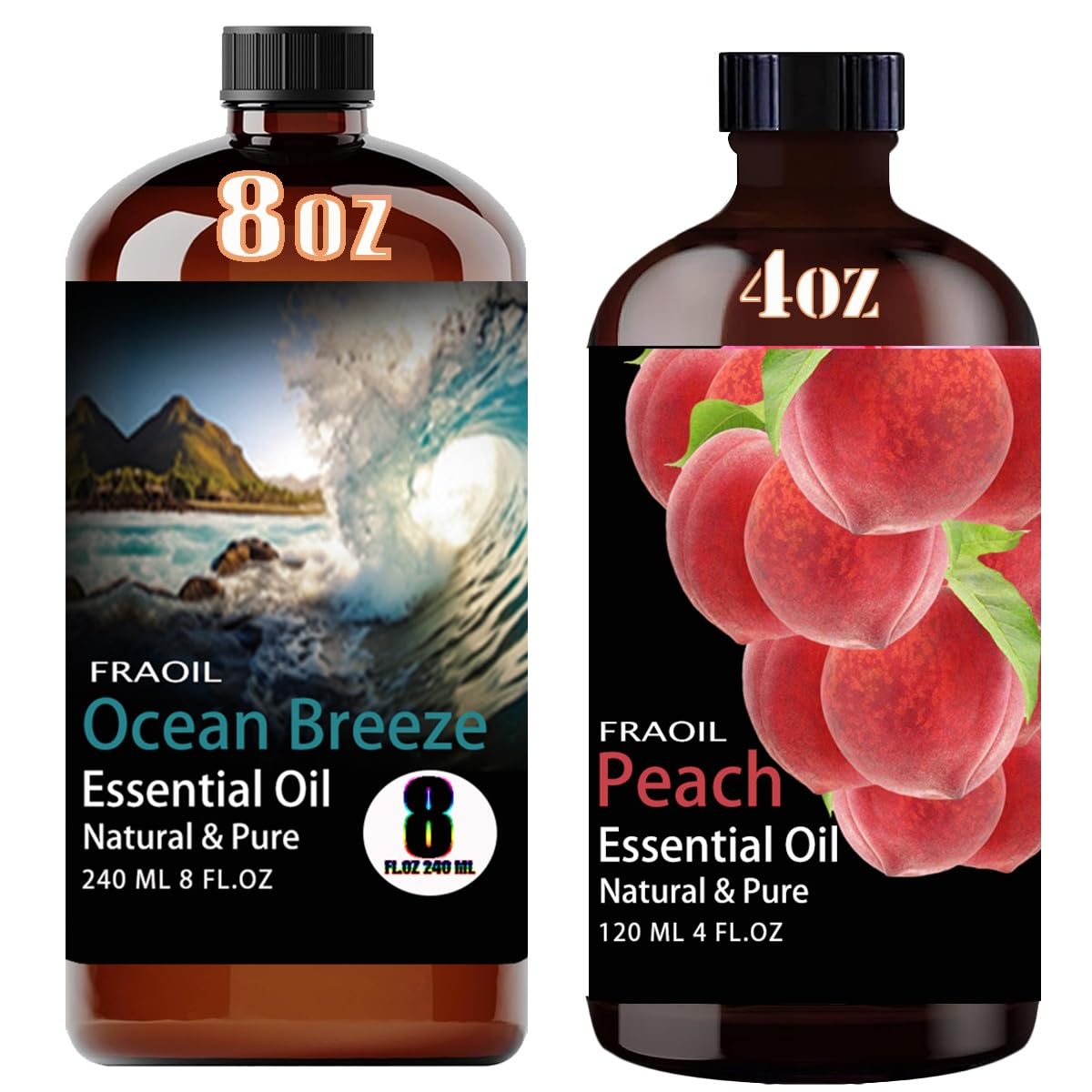 Ocean Breeze Essential Oil 8 Fl Oz and Peach Essential Oil 4 Fl Oz for Diffuser Humidifier Yoga Cleaning DIY Candle Soap Making Perfume Gift for Essential Oils